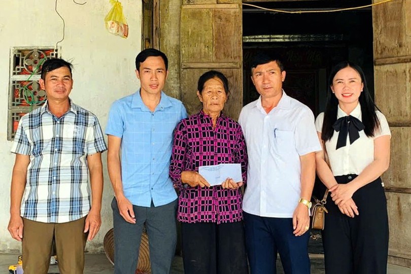 | Lãnh đạo MTTQ xã đến trao quà, động viên bà Lê Thị Khi - hộ nghèo ở thôn Vĩnh Thọ |