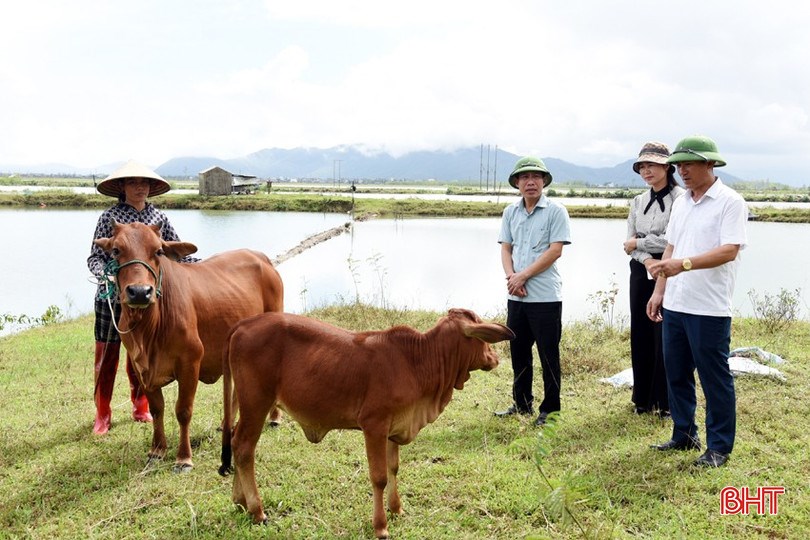 | Lãnh đạo xã Kỳ Khang động viên, chia sẻ với chị Lê Thị Hà (thôn Sơn Bắc) có chồng bị bệnh K, 2 con đang học đại học (gia đình vừa được hỗ trợ bò, tạo sinh kế) |