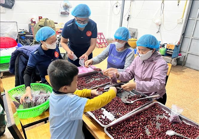 | Thành viên Câu lạc bộ Tình nguyện Thái Bình chuẩn bị các loại thực phẩm để chuyển đến đồng bào vùng lũ. Ảnh: Thế Duyệt/TTXVN |