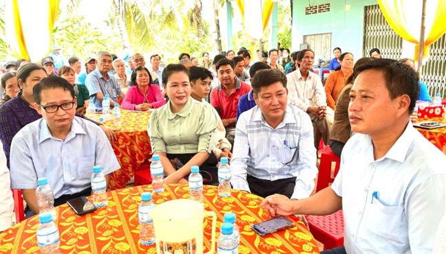 | Cán bộ các xã Tân Hưng và người dân tham dự lễ bàn giao nhà đại đoàn kết |