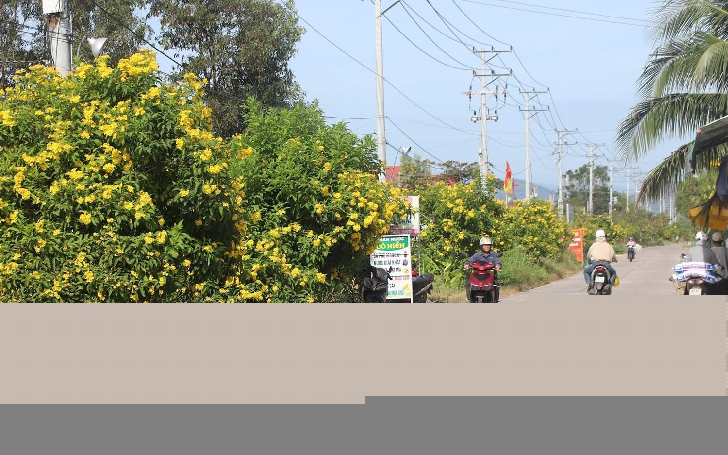 | Tuyến đường vào thôn Suối Đá, xã Hồng Sơn rực rỡ sắc màu của hoa hoàng yến, một khung cảnh làng quê yên bình. |
