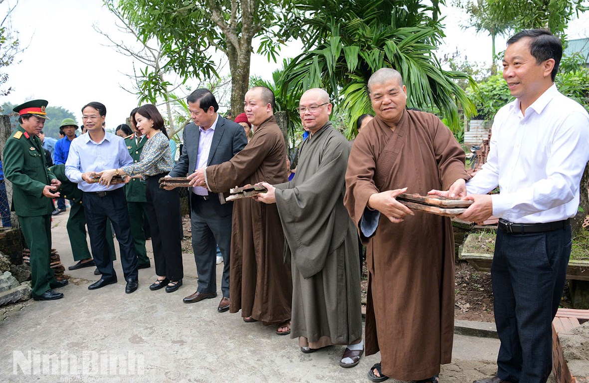 | Lãnh đạo Ủy ban MTTQ Việt Nam xã Phát Diệm cùng các chức sắc tôn giáo tham gia hỗ trợ người dân xây Nhà "Đại Đoàn kết". |