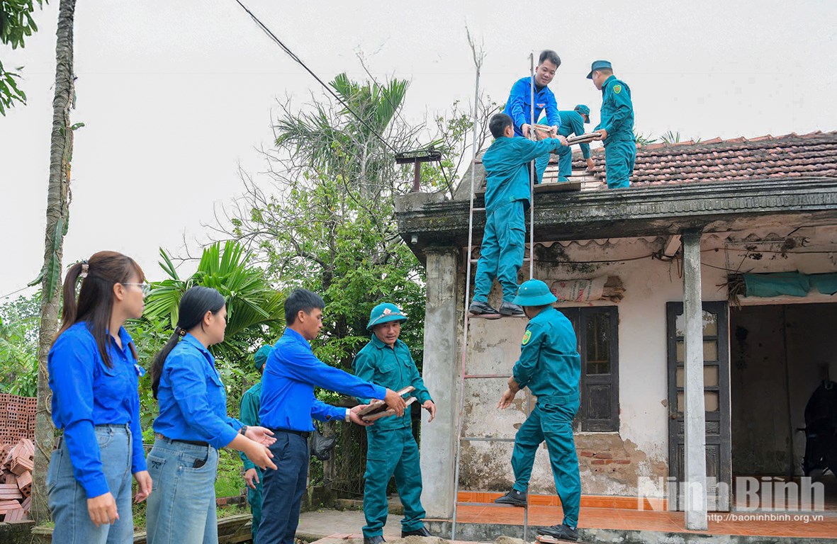 | Đoàn Thanh niên xã cùng lực lượng Dân quân tự vệ xã Phát Diệm giúp đỡ người dân xây Nhà “Đại Đoàn kết”. |