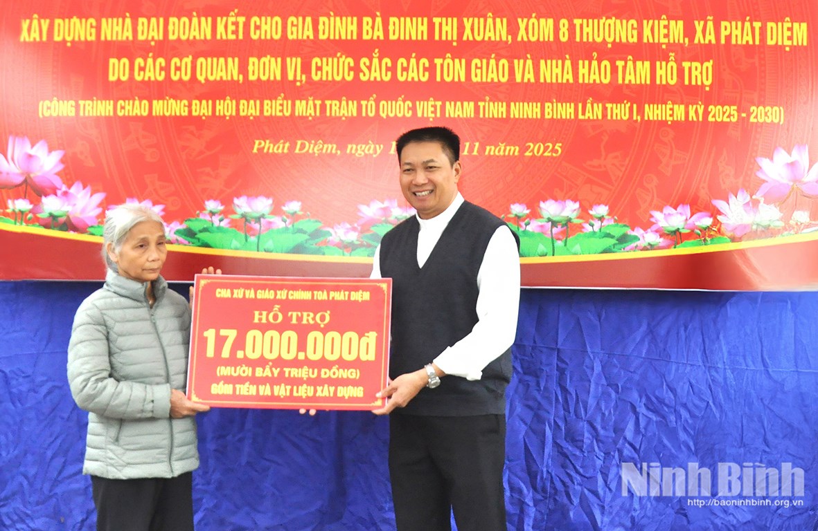 | Cha xứ và giáo xứ Chính tòa Phát Diệm hỗ trợ gia đình bà Đinh Thị Xuân, xóm 8 Thượng Kiệm xây Nhà “Đại Đoàn kết”. |