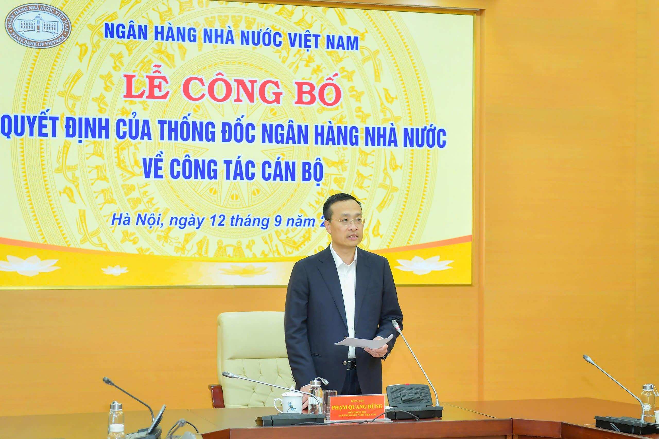 Thay mặt Ban Thường vụ Đảng ủy, Ban lãnh đạo NHNN, Phó Thống đốc Phạm Quang Dũng gửi lời chúc mừng và bày tỏ kỳ vọng hai tân Phó Chánh Thanh tra sẽ nhanh chóng bắt nhịp công việc, phát huy năng lực, bản lĩnh để cùng tập thể đơn vị hoàn thành xuất sắc nhiệm vụ. Đồng thời, Phó Thống đốc đề nghị Ban lãnh đạo và cán bộ chủ chốt của Thanh tra NHNN tiếp tục đoàn kết, đồng hành, hỗ trợ các đồng chí mới được bổ nhiệm, bảo đảm công tác của đơn vị vận hành thông suốt, hiệu quả.