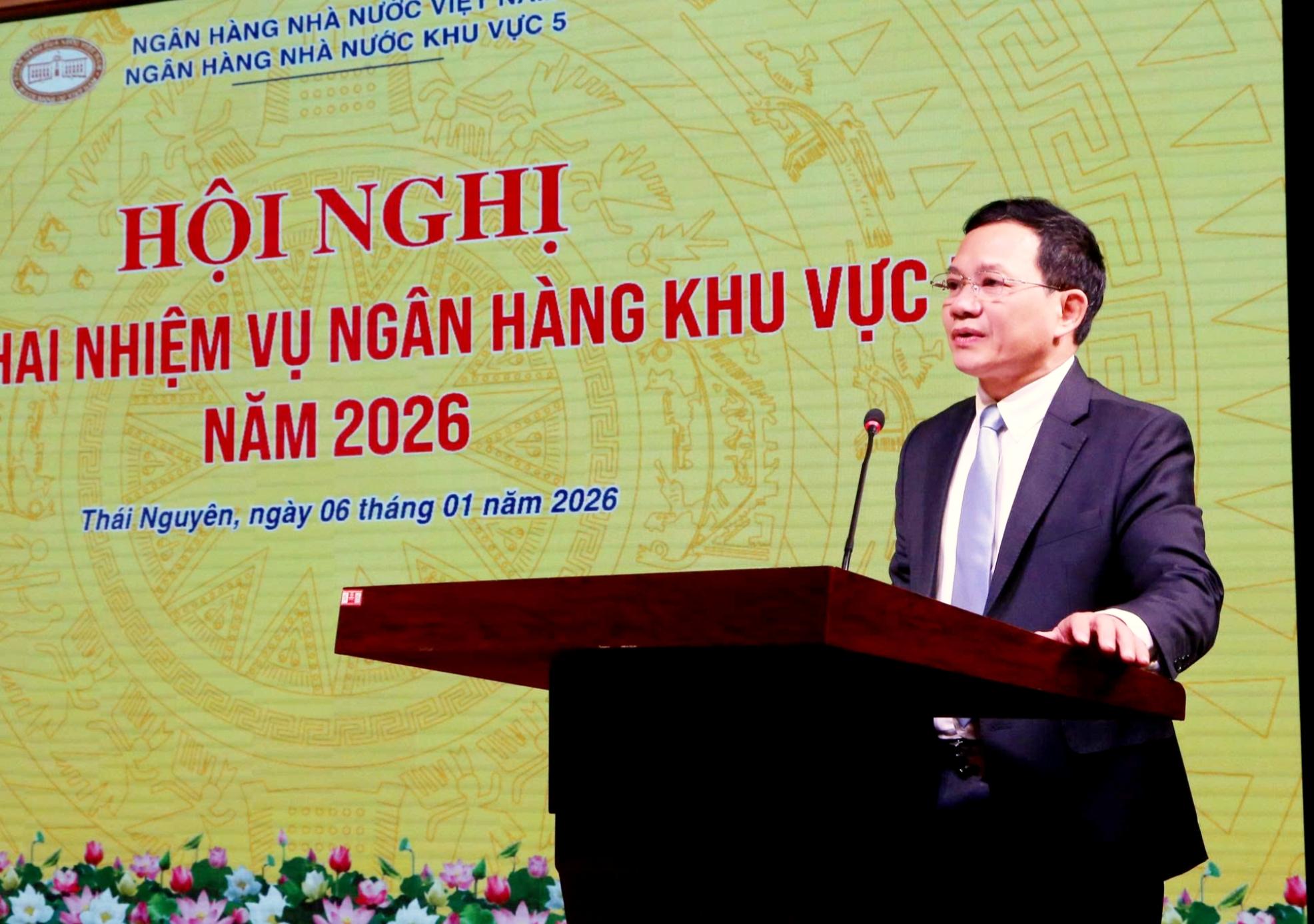 Sáng ngày 06/01, Ngân hàng Nhà nước (NHNN) Khu vực 5 đã tổ chức Hội nghị triển khai nhiệm vụ ngân hàng khu vực 5 năm 2026. Hội nghị có sự tham dự của đồng chí Đoàn Thái Sơn - Phó Bí thư Thường trực Đảng ủy, Phó Thống đốc Thường trực NHNN, đồng chí Nguyễn Linh - Ủy viên Ban Thường vụ Tỉnh ủy, Phó Chủ tịch UBND tỉnh Thái Nguyên; đồng chí Vũ Đình Quang - Ủy viên Ban Thường vụ Tỉnh ủy, Phó Chủ tịch UBND tỉnh Cao Bằng; cùng đại diện lãnh đạo các đơn vị thuộc NHNN; các sở, ngành tỉnh Thái Nguyên, Cao Bằng, Lạng Sơn,..; lãnh đạo, cán bộ chủ chốt NHNN Khu vực 5 và các chi nhánh TCTD trên địa bàn.