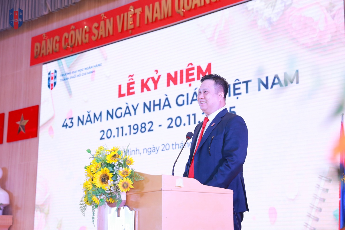 Trong diễn văn chào mừng, NGƯT. PGS.TS. Đoàn Thanh Hà - Bí thư Đảng ủy, Chủ tịch Hội đồng Trường xúc động gửi lời tri ân sâu sắc đến các thế hệ thầy cô Trường Đại học Ngân hàng TP. Hồ Chí Minh. Thầy nhấn mạnh, gần nửa thế kỷ hình thành và phát triển của HUB được viết nên từ tâm huyết, trí tuệ và sự hy sinh thầm lặng của đội ngũ nhà giáo, những người đã chọn ở lại với bụi phấn, với giảng đường để đồng hành cùng bao thế hệ sinh viên trưởng thành. Trong hành trình hội nhập và đổi mới, HUB luôn kiên định lấy người học làm trung tâm, lấy chất lượng đào tạo và trách nhiệm với cộng đồng làm kim chỉ nam.
