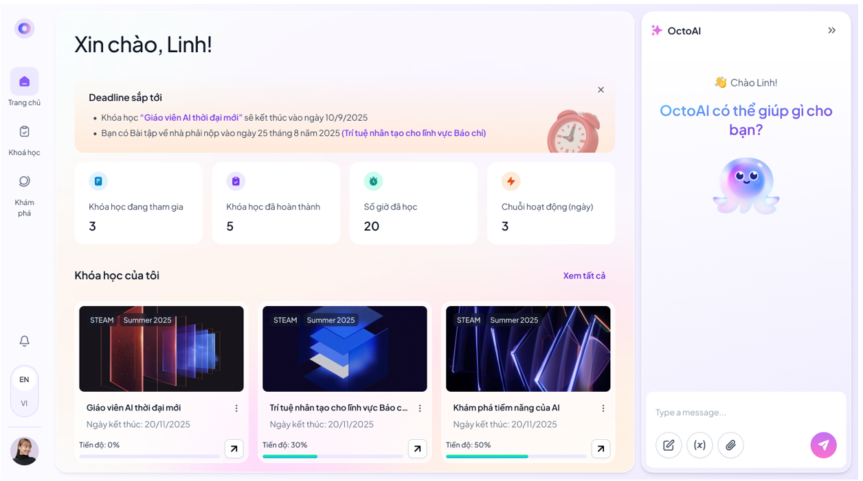Với dự án, điểm khác biệt lớn nhất nằm ở mô hình song hành: một trợ lý chuyên cung cấp kho học liệu AI đã được Việt hóa, trong khi trợ lý còn lại đóng vai “gia sư trực tuyến”, trực tiếp đồng hành cùng giáo viên trong việc bồi dưỡng kỹ năng số và gợi ý ứng dụng ngay tại lớp học. OctoAI không chỉ mang đến tri thức mà còn nuôi dưỡng năng lực áp dụng – yếu tố then chốt giúp giáo viên thích nghi trong thời đại AI mới. Bên cạnh đó, OctoAI còn được phát triển với giao diện trực quan, cho phép giáo viên dễ dàng theo dõi tiến độ, tham gia lớp học và quản lý hành trình học tập.