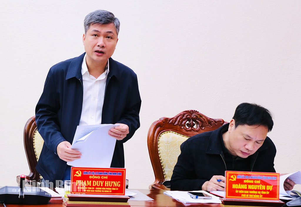 Tại hội nghị, các đại biểu đã thảo luận, cho ý kiến vào Dự thảo Báo cáo kết quả lãnh đạo thực hiện nhiệm vụ tháng 10; trọng tâm công tác tháng 11 năm 2025 và thống nhất đánh giá: Trong tháng 10, Đảng ủy, Ban Thường vụ Đảng ủy đã tập trung lãnh đạo, chỉ đạo chuẩn bị chu đáo các điều kiện và tổ chức Đoàn đại biểu Đảng bộ các cơ quan Đảng tỉnh dự Đại hội Đảng bộ tỉnh Ninh Bình lần thứ I, nhiệm kỳ 2025 - 2030 đảm bảo an toàn, nghiêm túc; tham gia đầy đủ, có trách nhiệm các hoạt động của Đại hội. Sau Đại hội, Đảng ủy đã chỉ đạo tổ chức thông tin kịp thời kết quả Đại hội đến các tổ chức cơ sở đảng bằng nhiều hình thức phù hợp.