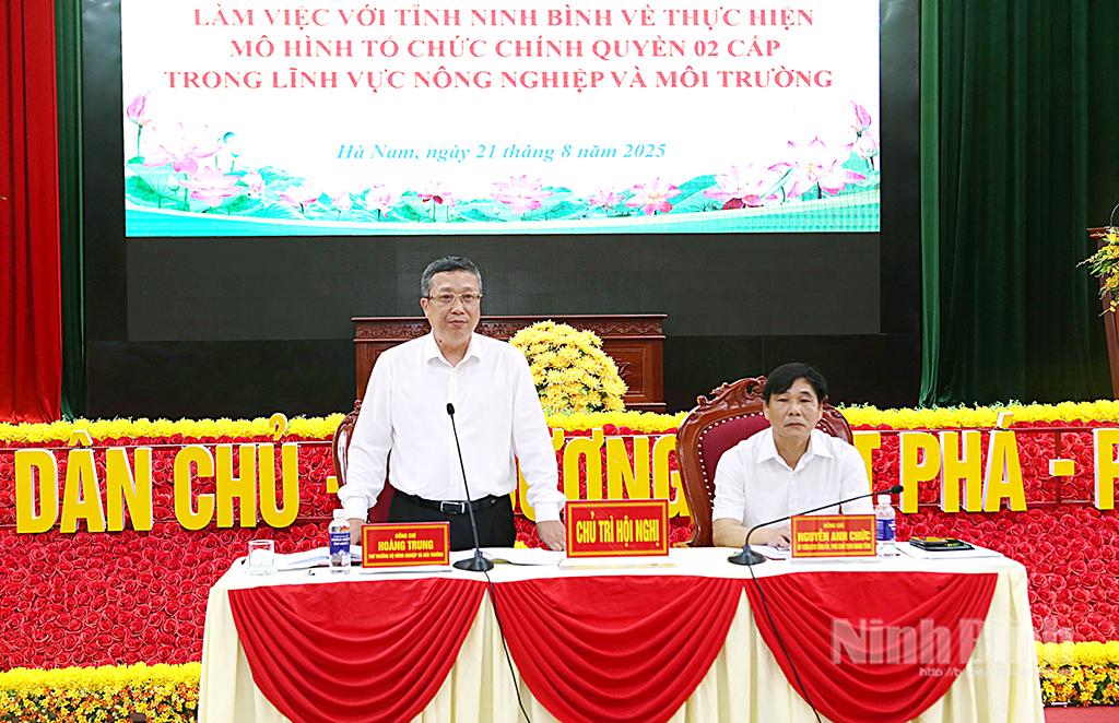 Bộ NN&MT cũng đang khẩn trương xây dựng Thông tư hướng dẫn thống nhất về chức năng, nhiệm vụ của các đơn vị sự nghiệp công lập trong lĩnh vực NN&MT, tạo cơ sở pháp lý vững chắc cho các địa phương trong việc sắp xếp bộ máy. Thứ trưởng Hoàng Trung bày tỏ mong muốn những giải pháp này sẽ giúp ngành NN&MT tỉnh Ninh Bình vận hành hiệu quả mô hình chính quyền địa phương hai cấp, đáp ứng yêu cầu phát triển và hội nhập.