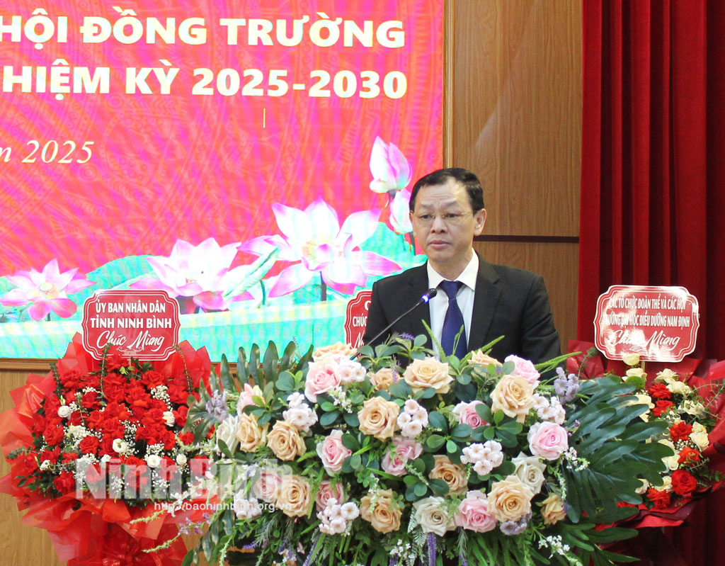 Phát biểu tại hội nghị, Thứ trưởng Bộ Y tế Nguyễn Tri Thức biểu dương những nỗ lực, thành tích của tập thể lãnh đạo, viên chức, người lao động, học viên, sinh viên nhà trường đã đạt được trong thời gian qua. Thứ trưởng Bộ Y tế khẳng định: Bước vào nhiệm kỳ mới, Trường Đại học Điều dưỡng Nam Định đang đứng trước những yêu cầu đổi mới toàn diện; đòi hỏi sự đoàn kết thống nhất, tư duy đổi mới và quyết tâm hành động của toàn thể hệ thống chính trị trong nhà trường; đề nghị đồng chí tân Chủ tịch Hội đồng trường nhiệm kỳ 2025-2030, cùng với Đảng ủy, Ban Giám hiệu và tập thể Hội đồng trường, cần tập trung phát huy vai trò nòng cốt trong công tác lãnh đạo, điều phối và hoạch định chiến lược phát triển dài hạn của nhà trường. Đồng thời, triển khai hiệu quả các chủ trương, nghị quyết của Đảng, Chính phủ và Bộ Y tế về giáo dục và đào tạo nhân lực y tế chất lượng cao. Để thực hiện được các mục tiêu đó, Thứ trưởng Bộ Y tế nhấn mạnh các nhiệm vụ trọng tâm: phát huy khối đoàn kết nội bộ; tiếp tục đổi mới, sắp xếp tổ chức bộ máy và nâng cao chất lượng đội ngũ; giữ vững và nâng cao chất lượng đào tạo; đẩy mạnh nghiên cứu khoa học và chuyển giao công nghệ; thúc đẩy chuyển đổi số; chủ động huy động và phát huy hiệu quả các nguồn lực đầu tư…