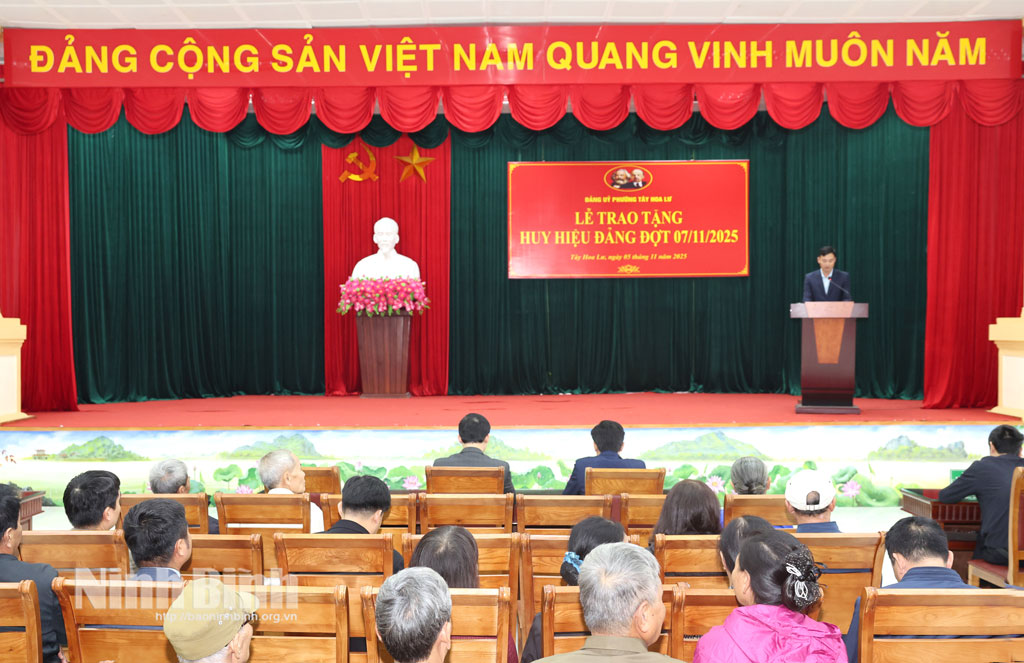 Chiều 5/11, Đảng ủy phường Tây Hoa Lư tổ chức Lễ trao tặng Huy hiệu Đảng cho các đảng viên thuộc Đảng bộ phường. Dự buổi lễ có đồng chí Cao Trường Sơn, Tỉnh ủy viên, Bí thư Đảng ủy phường cùng lãnh đạo cấp ủy, chính quyền địa phương.