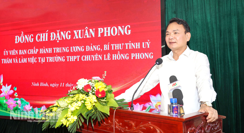 Phát biểu tại buổi làm việc, đồng chí Bí thư Tỉnh ủy Đặng Xuân Phong bày tỏ vui mừng khi lần đầu tiên về thăm Trường THPT chuyên Lê Hồng Phong, ngôi trường giàu truyền thống với trên một thế kỷ xây dựng và trưởng thành, cái nôi bồi dưỡng nhân tài và là niềm tự hào của ngành Giáo dục tỉnh nhà. Đồng chí Bí thư Tỉnh ủy đã chúc mừng, ghi nhận và biểu dương những thành tích xuất sắc mà thầy và trò nhà trường đã đạt được trong thời gian qua. Đồng chí nhấn mạnh: Nghị quyết Đại hội Đảng bộ tỉnh nhiệm kỳ 2025-2030 xác định “Tập trung phát triển nguồn nhân lực chất lượng cao” là một trong ba khâu đột phá chiến lược nhằm thực hiện hoá mục tiêu “phấn đấu đến năm 2030, Ninh Bình trở thành thành phố trực thuộc Trung ương; có công nghiệp hiện đại, dịch vụ du lịch chất lượng cao, đô thị xanh gắn với di sản, nằm trong nhóm các địa phương dẫn đầu cả nước về tốc độ tăng trưởng, thu nhập bình quân đầu người”. Để hiện thực hóa khát vọng đó, con đường căn bản và bền vững nhất chính là dựa vào tri thức, khoa học công nghệ và đặc biệt là nguồn nhân lực chất lượng cao và vai trò của các trường chuyên trong hành trình này là hết sức to lớn.