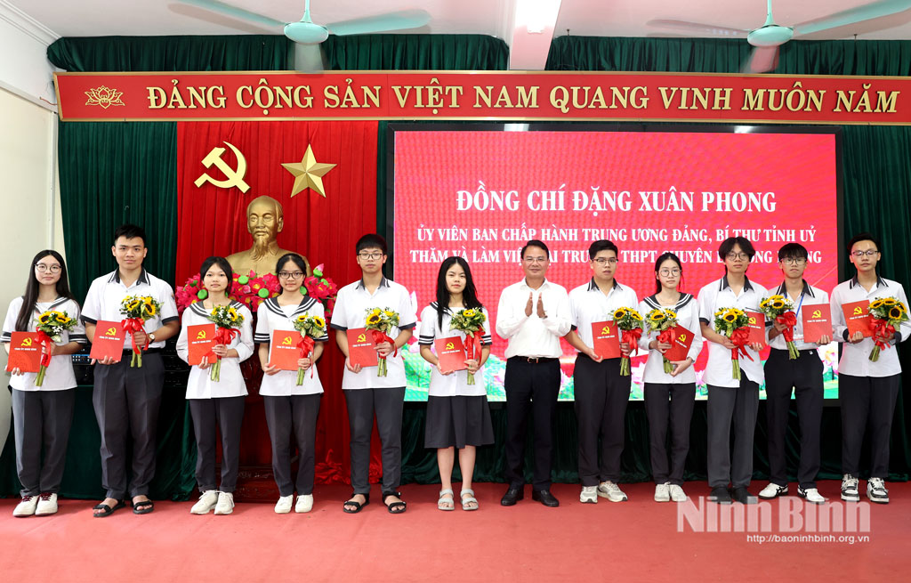 Trong buổi đến thăm, đồng chí Bí thư Tỉnh ủy Đặng Xuân Phong đã tặng hoa, trao quà chúc mừng 11 học sinh của Trường THPT chuyên Lê Hồng Phong có thành tích xuất sắc trong học tập.