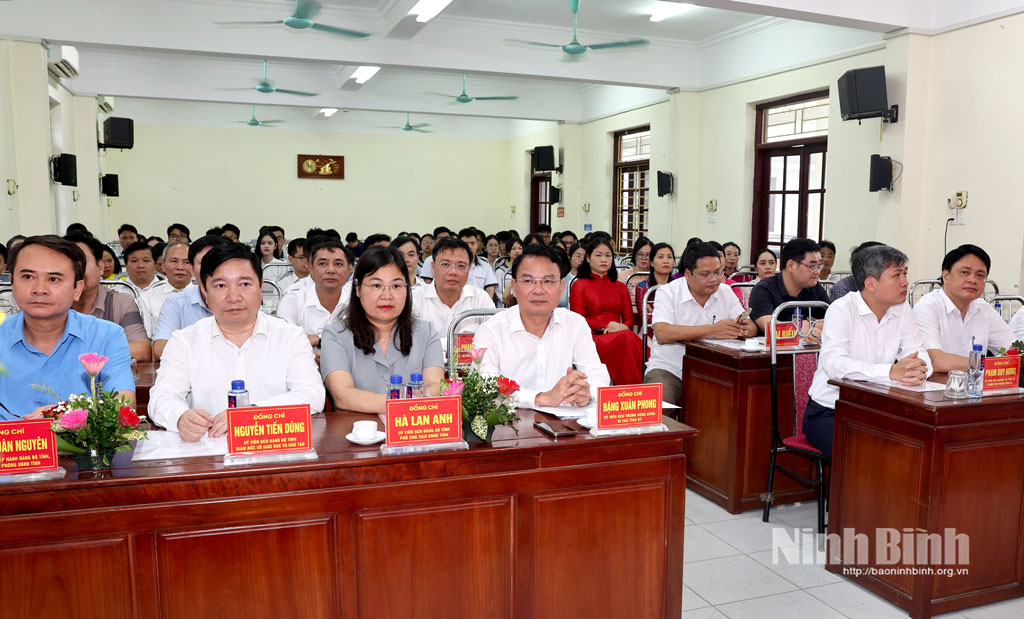 Báo cáo với đồng chí Bí thư Tỉnh ủy và Đoàn công tác, lãnh đạo Trường THPT chuyên Lê Hồng Phong cho biết: Tại kỳ thi chọn học sinh giỏi Quốc gia năm học 2024-2025, nhà trường đoạt 84 giải/99 học sinh dự thi (chiếm tỉ lệ 84,84%); Trong đó có 1 giải Nhất, 26 giải Nhì, 34 giải Ba, 23 giải Khuyến khích; thuộc top 10 tỉnh trên toàn quốc có tỉ lệ đạt giải cao. Kỳ thi tốt nghiệp THPT năm 2025, điểm trung bình các môn toàn trường đạt 7,88; xếp thứ Nhất toàn tỉnh Ninh Bình; 100% học sinh khối 12 của trường tiếp tục học lên Đại học thuộc các trường Đại học trong nước và nước ngoài