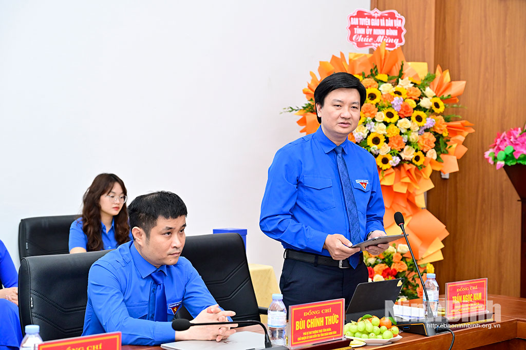 Thay mặt Tỉnh đoàn, đồng chí Bí thư Tỉnh đoàn Trần Ngọc Nam cảm ơn sự quan tâm của các đồng chí lãnh đạo tỉnh, đồng thời khẳng định tuổi trẻ Ninh Bình sẽ tiếp tục nỗ lực, phát huy vai trò xung kích, sáng tạo, góp phần thực hiện thắng lợi mục tiêu xây dựng Ninh Bình phát triển nhanh, bền vững, hướng tới trở thành thành phố trực thuộc Trung ương vào năm 2030.