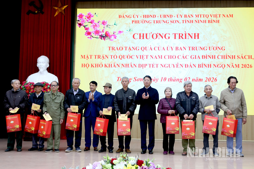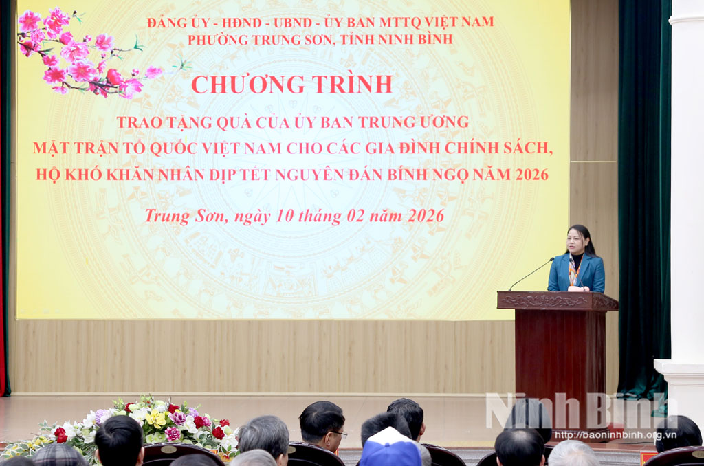 Phát biểu tại chương trình, đồng chí Nguyễn Thị Thu Hà, Ủy viên Trung ương Đảng, Phó Chánh Văn phòng Thường trực Văn phòng Trung ương Đảng ghi nhận, đánh giá cao những kết quả phát triển kinh tế - xã hội, công tác chăm lo đời sống Nhân dân của tỉnh Ninh Bình nói chung và phường Trung Sơn nói riêng thời gian qua. Đồng chí nhấn mạnh, Đảng, Nhà nước và MTTQ Việt Nam luôn xác định công tác chăm lo Tết cho Nhân dân, nhất là các đối tượng chính sách, hộ nghèo, hộ có hoàn cảnh khó khăn là nhiệm vụ chính trị quan trọng, thể hiện truyền thống tốt đẹp “uống nước nhớ nguồn” của dân tộc ta. Đồng chí đề nghị cấp ủy, chính quyền, MTTQ và các tổ chức chính trị - xã hội địa phương tiếp tục quan tâm rà soát, nắm chắc tình hình đời sống Nhân dân, triển khai đồng bộ các chính sách an sinh xã hội, huy động nguồn lực xã hội để chăm lo tốt hơn đời sống người dân, không để ai bị bỏ lại phía sau. Đồng chí mong muốn các gia đình chính sách, hộ có hoàn cảnh khó khăn tiếp tục phát huy truyền thống cách mạng, nỗ lực vươn lên trong cuộc sống, tích cực tham gia các phong trào thi đua yêu nước, góp phần xây dựng địa phương ngày càng phát triển.