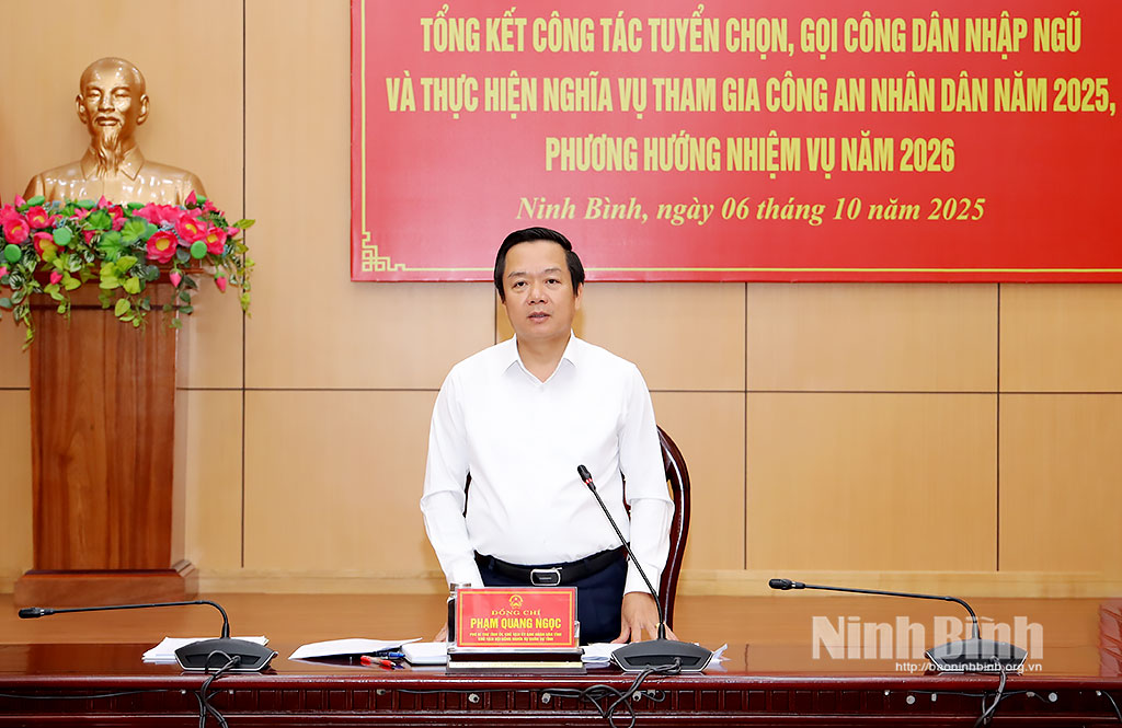 Sáng 6/10, Hội đồng Nghĩa vụ quân sự (NVQS) tỉnh tổ chức Hội nghị tổng kết công tác tuyển chọn, gọi công dân nhập ngũ và thực hiện nghĩa vụ tham gia Công an nhân dân năm 2025; triển khai nhiệm vụ năm 2026. Đồng chí Phạm Quang Ngọc, Phó Bí thư Tỉnh ủy, Chủ tịch UBND tỉnh, Chủ tịch Hội đồng NVQS tỉnh chủ trì hội nghị.