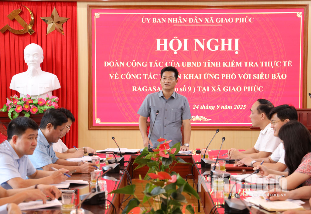 Trước đó, Đoàn công tác đã đi kiểm tra công tác ứng phó với siêu bão số 9 tại xã Giao Phúc, địa phương có vị trí ven biển, thường xuyên chịu ảnh hưởng trực tiếp của bão, triều cường. Tại đây, UBND xã đã báo cáo phương án hộ đê toàn tuyến, bảo vệ trọng điểm, di dời dân cư ra khỏi khu vực nguy hiểm, chuẩn bị đầy đủ lực lượng, phương tiện theo phương châm “4 tại chỗ”. Xã đã chỉ đạo các thôn, xóm triển khai các kịch bản ứng phó với siêu bão mạnh, gắn với nhiệm vụ sản xuất nông nghiệp, thủy sản và phát triển làng nghề.