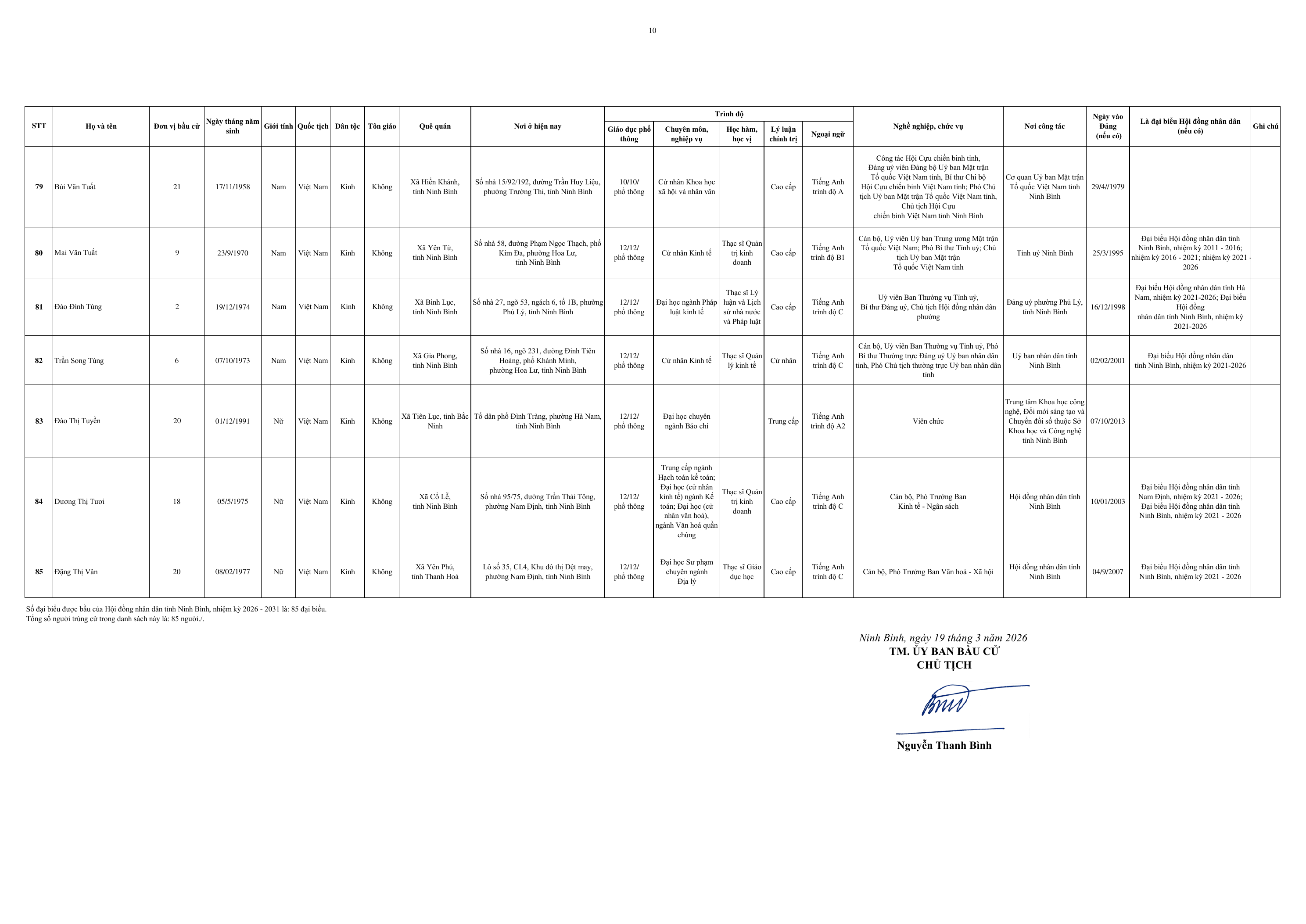 Ngày 19/3, Ủy ban Bầu cử đại biểu Quốc hội khoá XVI và bầu cử đại biểu HĐND tỉnh Ninh Bình nhiệm kỳ 2026-2031 ban hành Nghị quyết số 81/NQ-UBBC về công bố kết quả bầu cử và Danh sách những người trúng cử đại biểu HĐND tỉnh Ninh Bình khoá XVI, nhiệm kỳ 2026-2031.