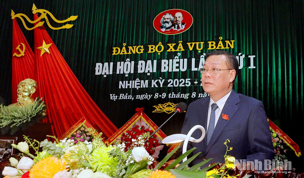 Phát biểu chỉ đạo tại Đại hội đại biểu Đảng bộ xã Vụ Bản lần thứ I, nhiệm kỳ 2025-2030, đồng chí Lê Quốc Chỉnh, Phó Bí thư Tỉnh ủy, Chủ tịch HĐND tỉnh đặc biệt nhấn mạnh: Đảng bộ xã cần nâng cao hơn nữa tinh thần trách nhiệm; tận dụng thời cơ, thuận lợi, vượt qua khó khăn, thách thức; đoàn kết, thống nhất, quyết tâm hướng tới mục tiêu đưa xã trở thành điểm đến du lịch tâm linh mang đậm bản sắc văn hoá truyền thống của vùng đất Thiên Bản, xây dựng xã Vụ Bản ngày càng phát triển nhanh, bền vững.