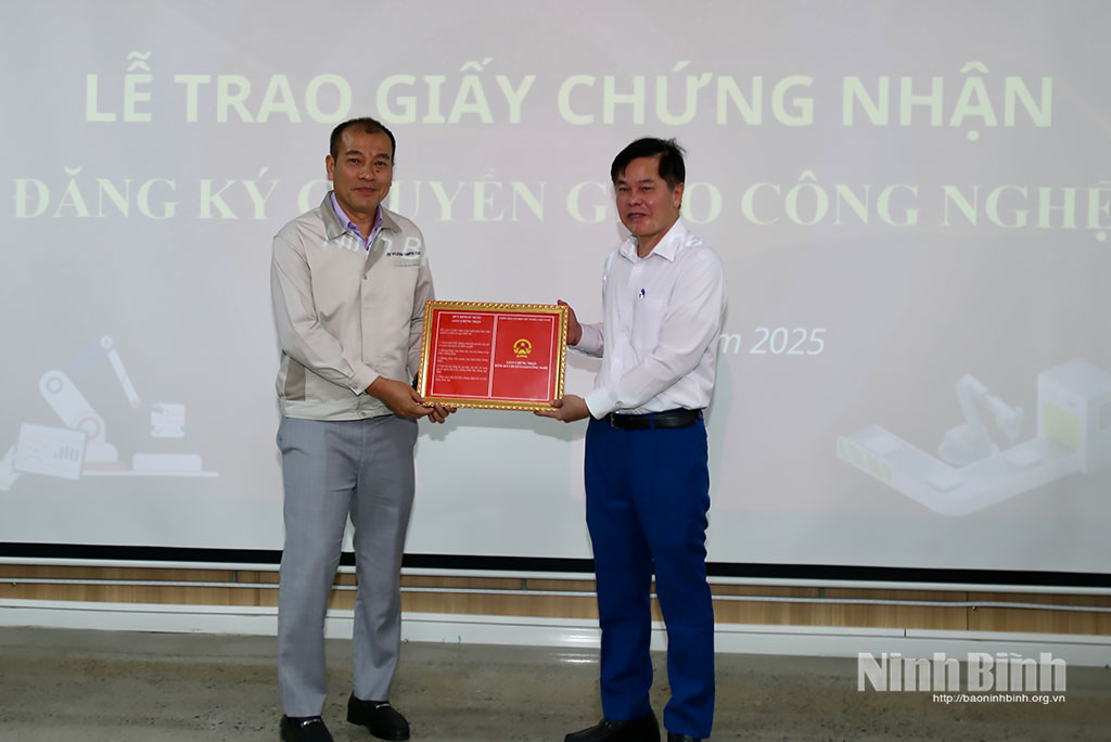 Tại hội nghị, đồng chí Giám đốc Sở Khoa học và Công nghệ Vũ Trọng Quế, đại diện cho đơn vị chứng nhận chuyển giao công nghệ trao Giấy chứng nhận Đăng ký chuyển giao công nghệ giữa Hyundai Moto Company Hàn Quốc cho Công ty Hyundai Thành Công Việt Nam.