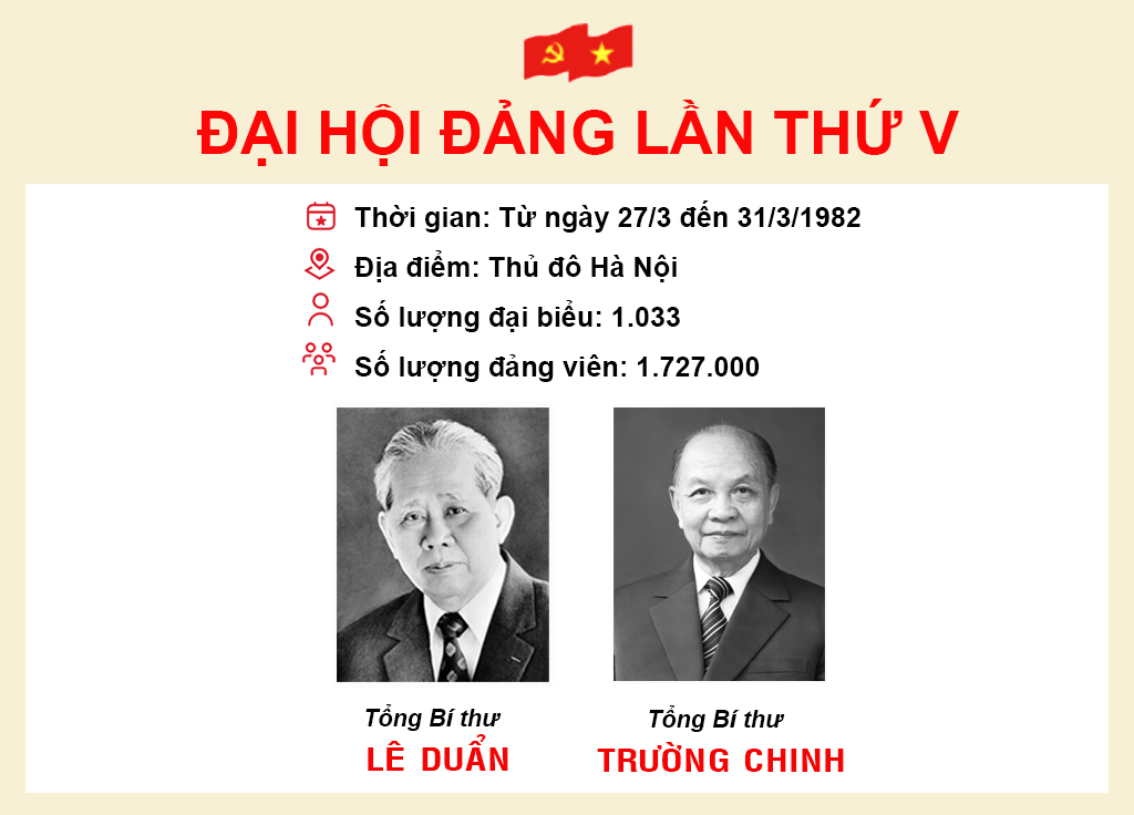 Từ ngày 27 đến 31/3/1982, Đại hội lần thứ V của Đảng được tổ chức tại Thủ đô Hà Nội. Tham dự Đại hội có 1.033 đại biểu đại diện cho hơn 1,72 triệu đảng viên sinh hoạt tại 35.146 đảng bộ cơ sở.