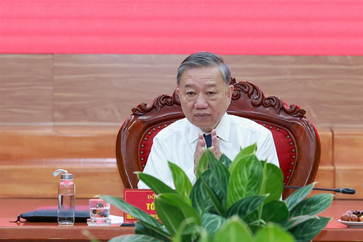 | Tổng Bí thư Tô Lâm cùng các đại biểu tham dự cuộc làm việc. |
