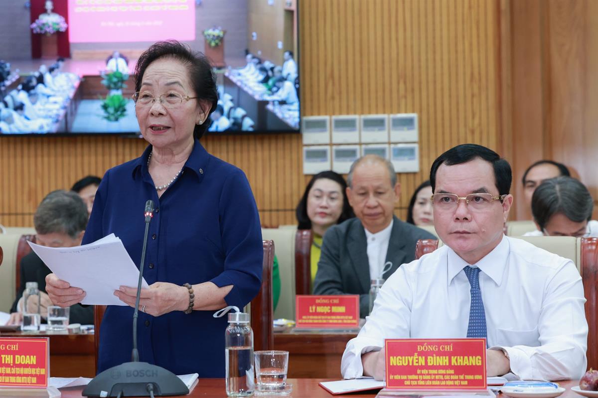 | Đồng chí Nguyễn Đình Khang, Ủy viên Trung ương Đảng, Ủy viên Ban Thường vụ Đảng ủy MTTQ, các đoàn thể Trung ương, Chủ tịch Tổng Liên đoàn Lao động Việt Nam phát biểu tại buổi làm việc. |