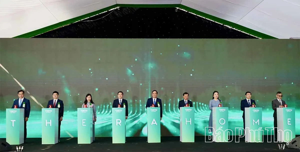 Các đồng chí lãnh đạo tỉnh và Tập đoàn Onsen Fuji thực hiện nghi thức bấm nút khởi công dự án.