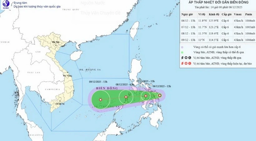 Dự báo, đến 13 giờ ngày 7/12, áp thấp nhiệt đới trên khu vực miền Trung Philippines, di chuyển theo hướng Tây Tây Nam với tốc độ 10-15 km/h. Sức gió mạnh nhất cấp 6, giật cấp 8.