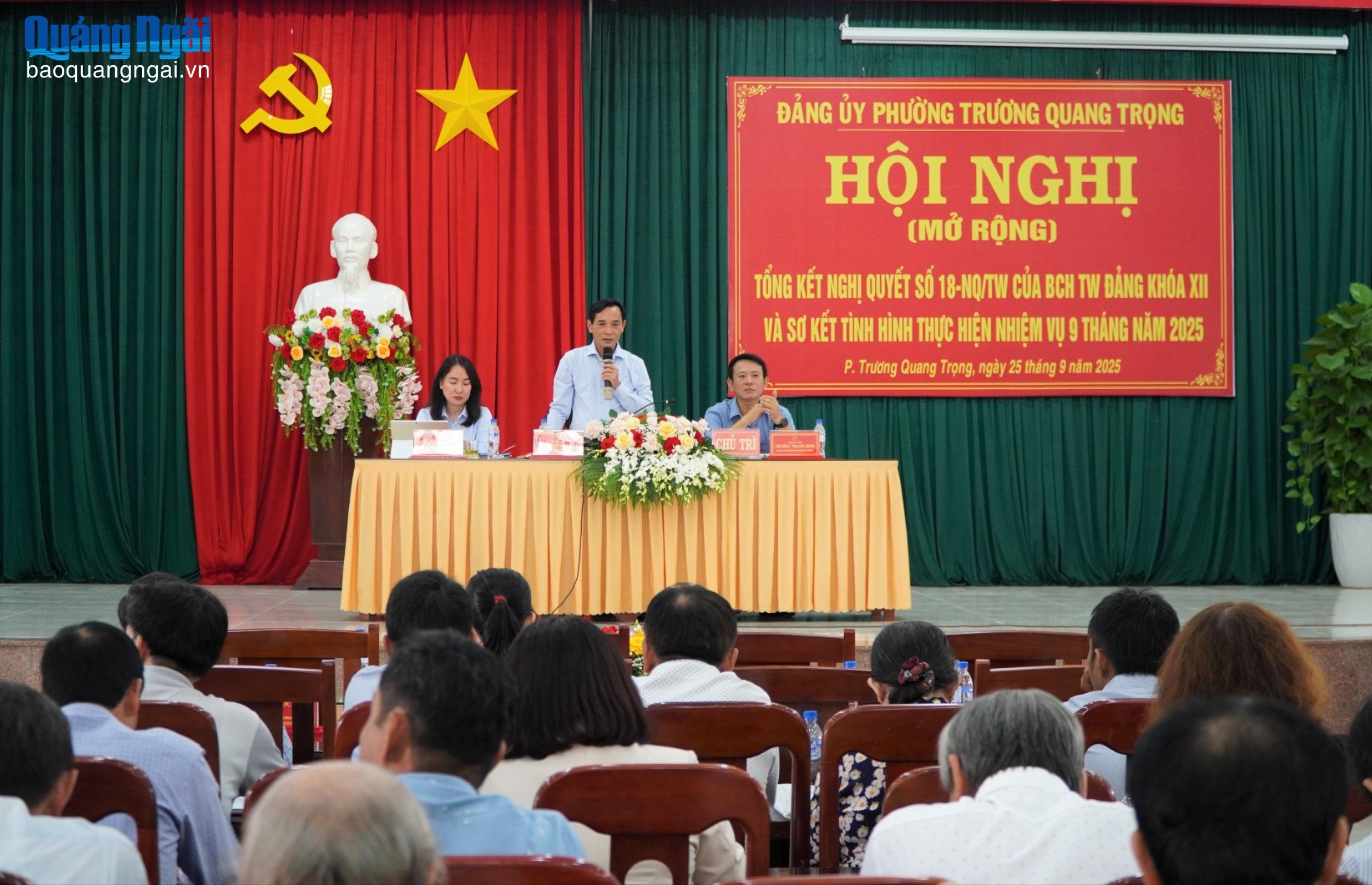 Sáng 25/9, Đảng ủy phường Trương Quang Trọng tổ chức Hội nghị (mở rộng) tổng kết Nghị quyết 18-NQ/TW của Ban Chấp hành Trung ương Đảng khóa XII; sơ kết tình hình thực hiện nhiệm vụ 9 tháng năm 2025 và công bố Quyết định của Ban Thường vụ Tỉnh ủy về chỉ định bổ sung Ủy viên Ban Chấp hành Đảng bộ phường, nhiệm kỳ 2025 - 2030.