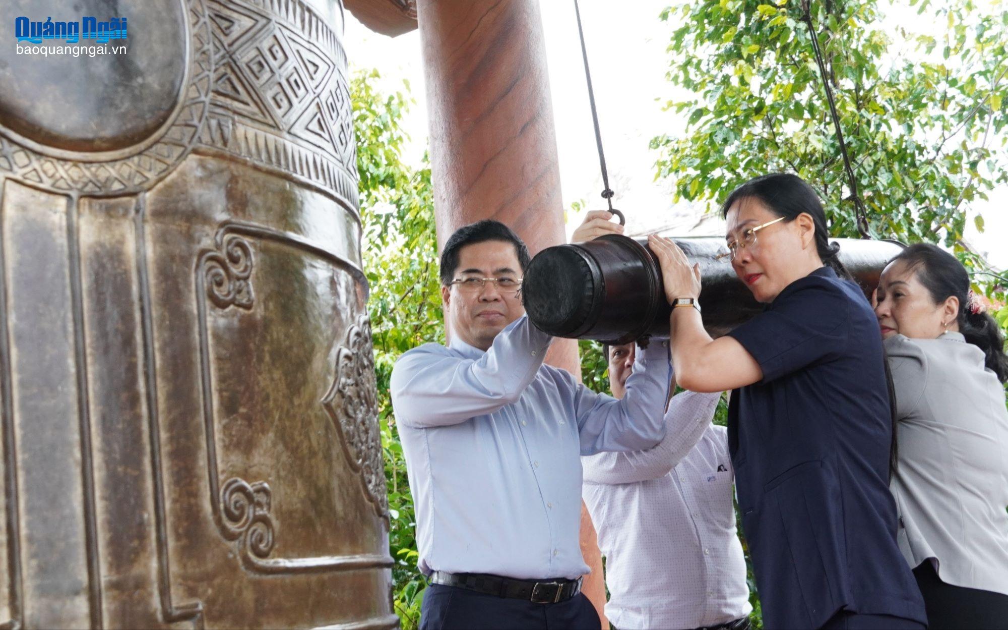 Ủy viên Trung ương Đảng, Bí thư Tỉnh ủy Bùi Thị Quỳnh Vân và các đồng chí lãnh đạo tỉnh thực hiện nghi thức thỉnh chuông tại Đền tưởng niệm Liệt sĩ Trường Sơn