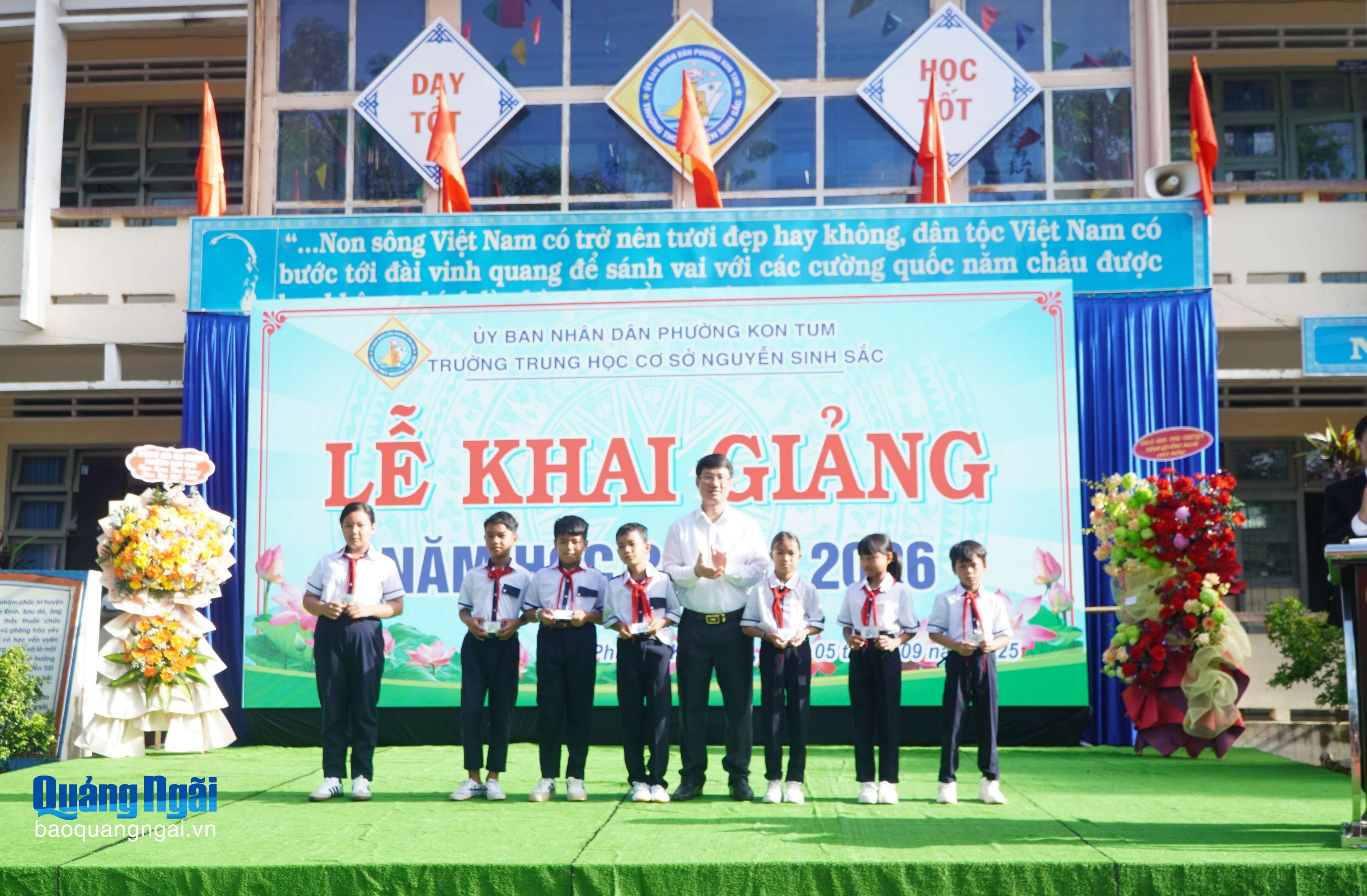 Ủy viên Ban Thường vụ Tỉnh ủy, Bí thư Đảng ủy phường Kon Tum Nguyễn Thanh Hà trao thưởng cho học sinh xuất sắc và thủ khoa vào lớp 10.