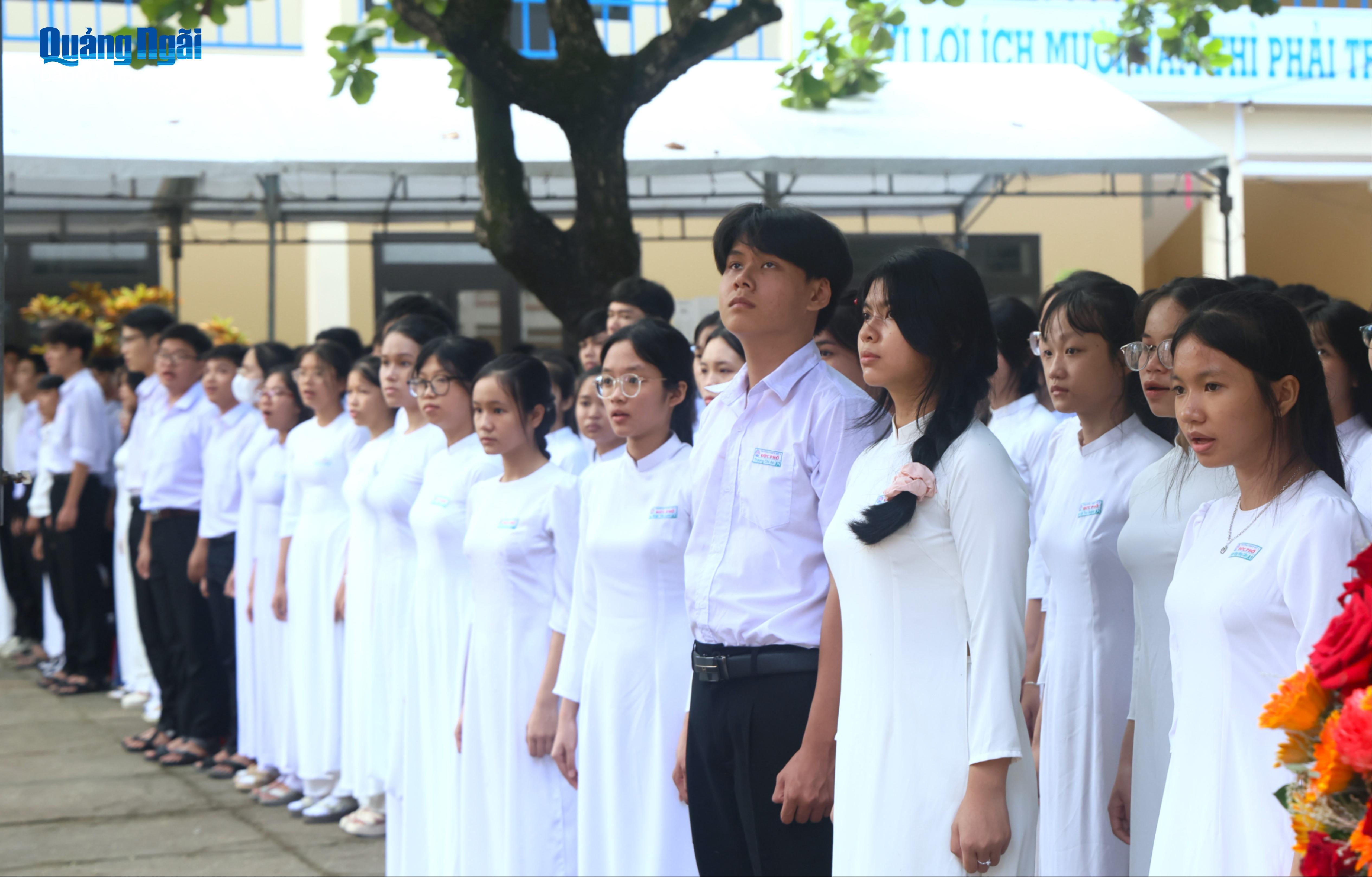Đúng 8 giờ, thầy và trò Trường THPT số 1 Đức Phổ tham dự Lễ kỷ niệm 80 năm truyền thống ngành Giáo dục và khai giảng năm học 2025 - 2026 trực tuyến do Bộ GD&ĐT tổ chức tại Trung tâm Hội nghị Quốc gia (Hà Nội). Đây là lần đầu tiên, học sinh, sinh viên trên cả nước tham dự lễ khai giảng chung, kết nối trực tuyến, cùng chào cờ và hát Quốc ca.