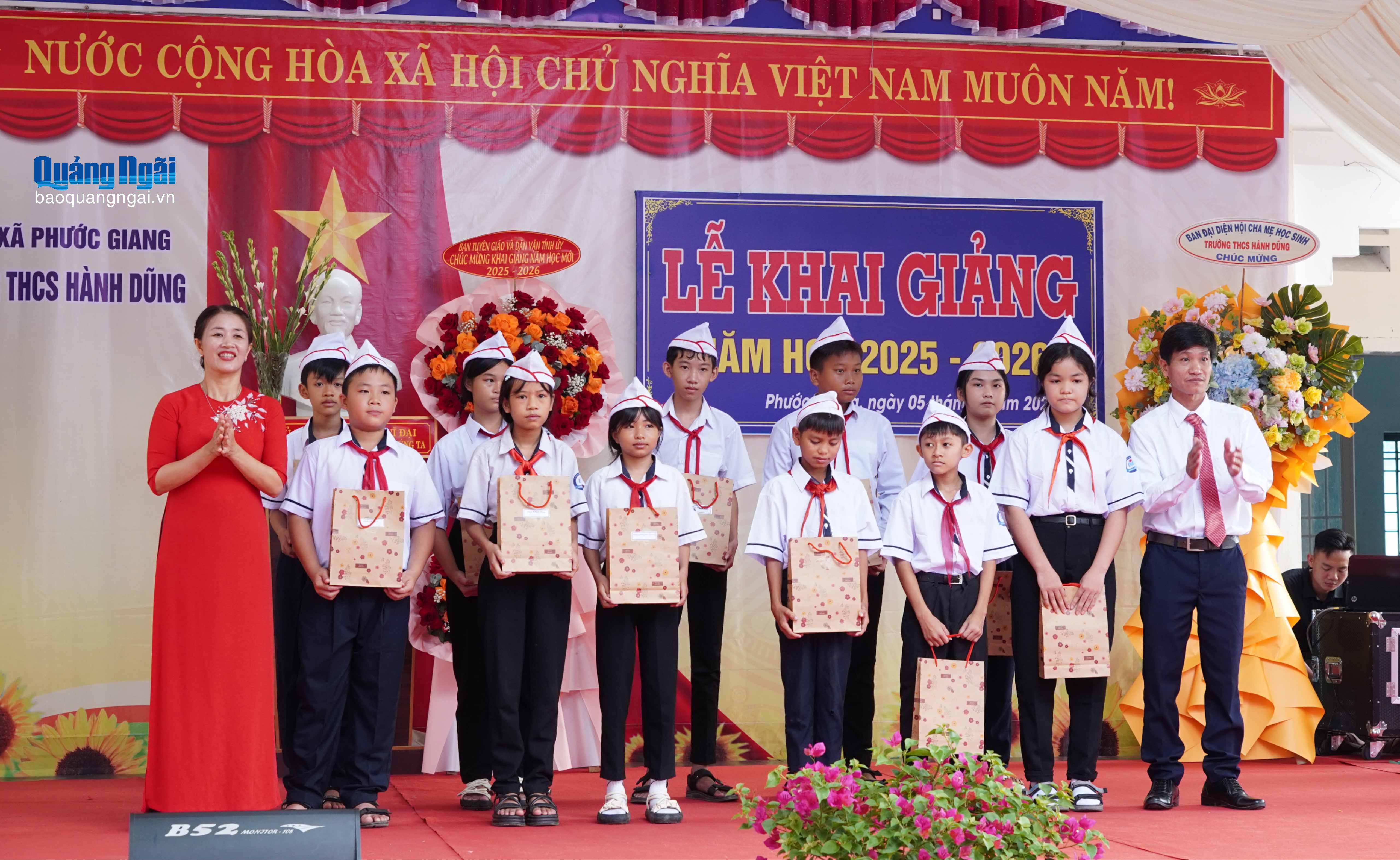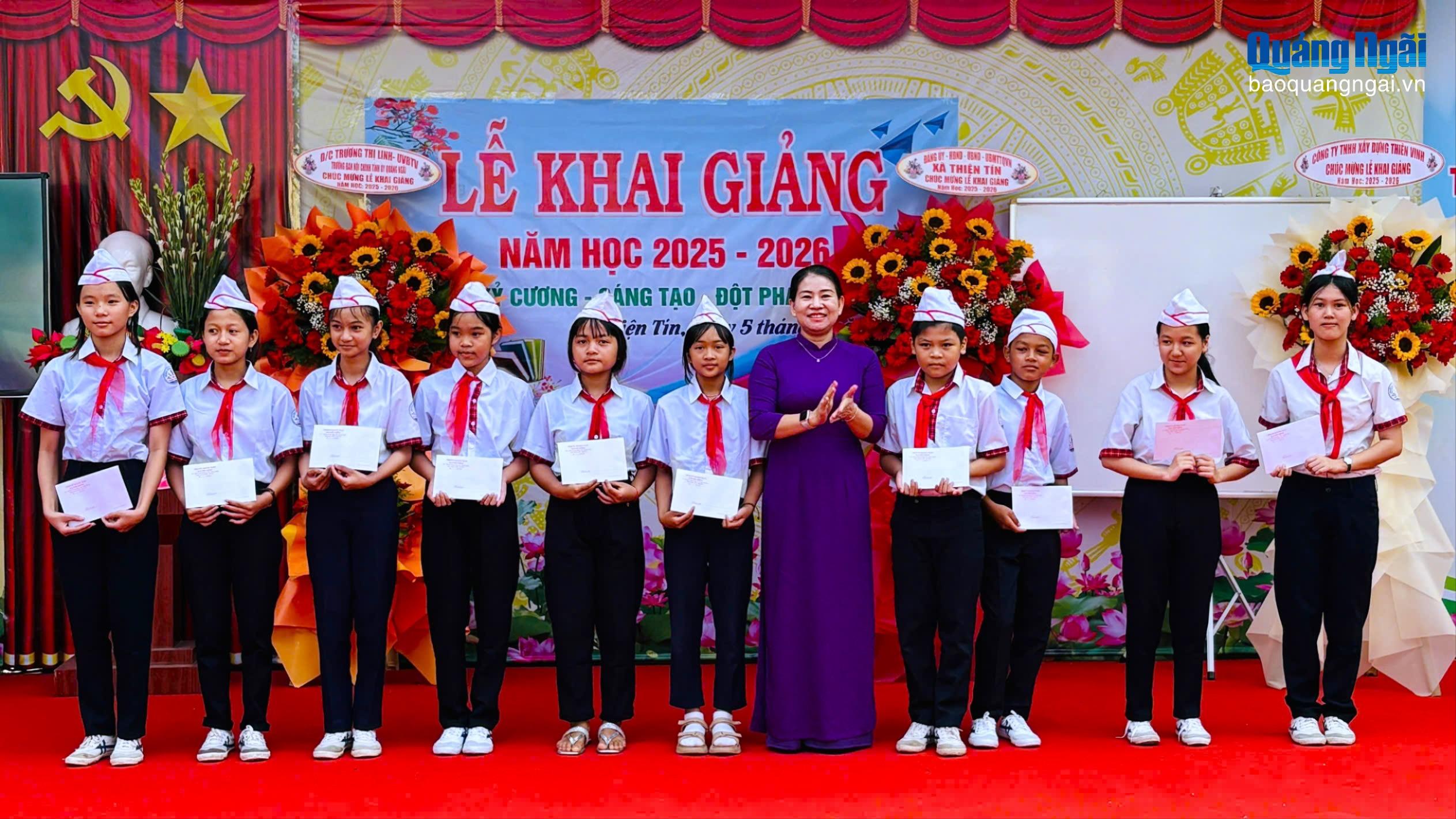 Nhân dịp khai giảng năm học mới, Trưởng ban Nội chính Tỉnh ủy Trương Thị Linh và lãnh đạo địa phương đã trao 20 suất học bổng, mỗi suất trị giá 500 nghìn đồng, tiếp sức cho các em học sinh có hoàn cảnh khó khăn.