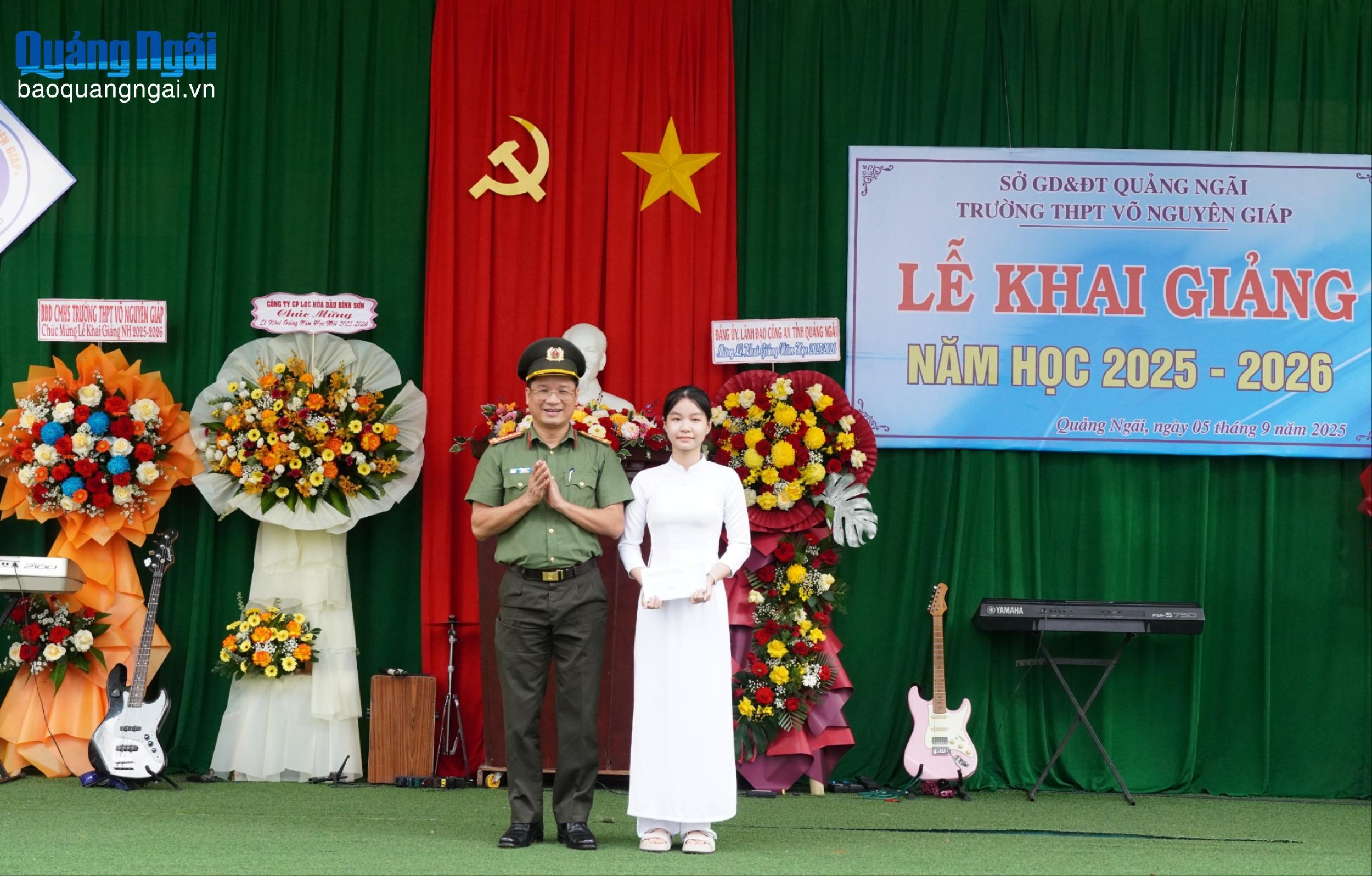 Đại tá Hồ Song Ân - Ủy viên Ban Thường vụ Tỉnh ủy, Giám đốc Công an tỉnh đã đến dự, chung vui ngày khai giảng với thầy và trò Trường THPT Võ Nguyên Giáp.