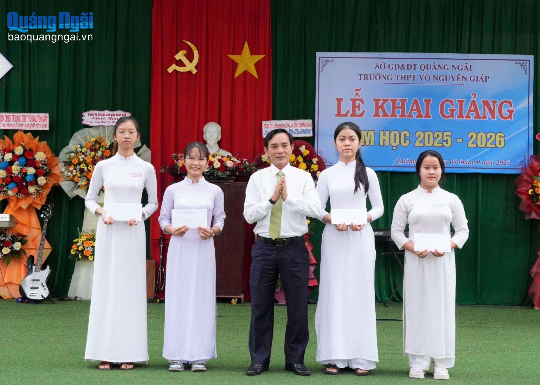 Dịp này, Trường THPT Võ Nguyên Giáp tặng 26 suất học bổng, trị giá 97 triệu đồng cho học sinh có thành tích, thủ khoa kỳ thi tuyển sinh vào lớp 10 năm học 2025 - 2026 và học sinh có hoàn cảnh khó khăn, vươn lên trong học tập. Kinh phí được trích từ nguồn quỹ học bổng của trường và hỗ trợ của các cá nhân, tổ chức, đơn vị.