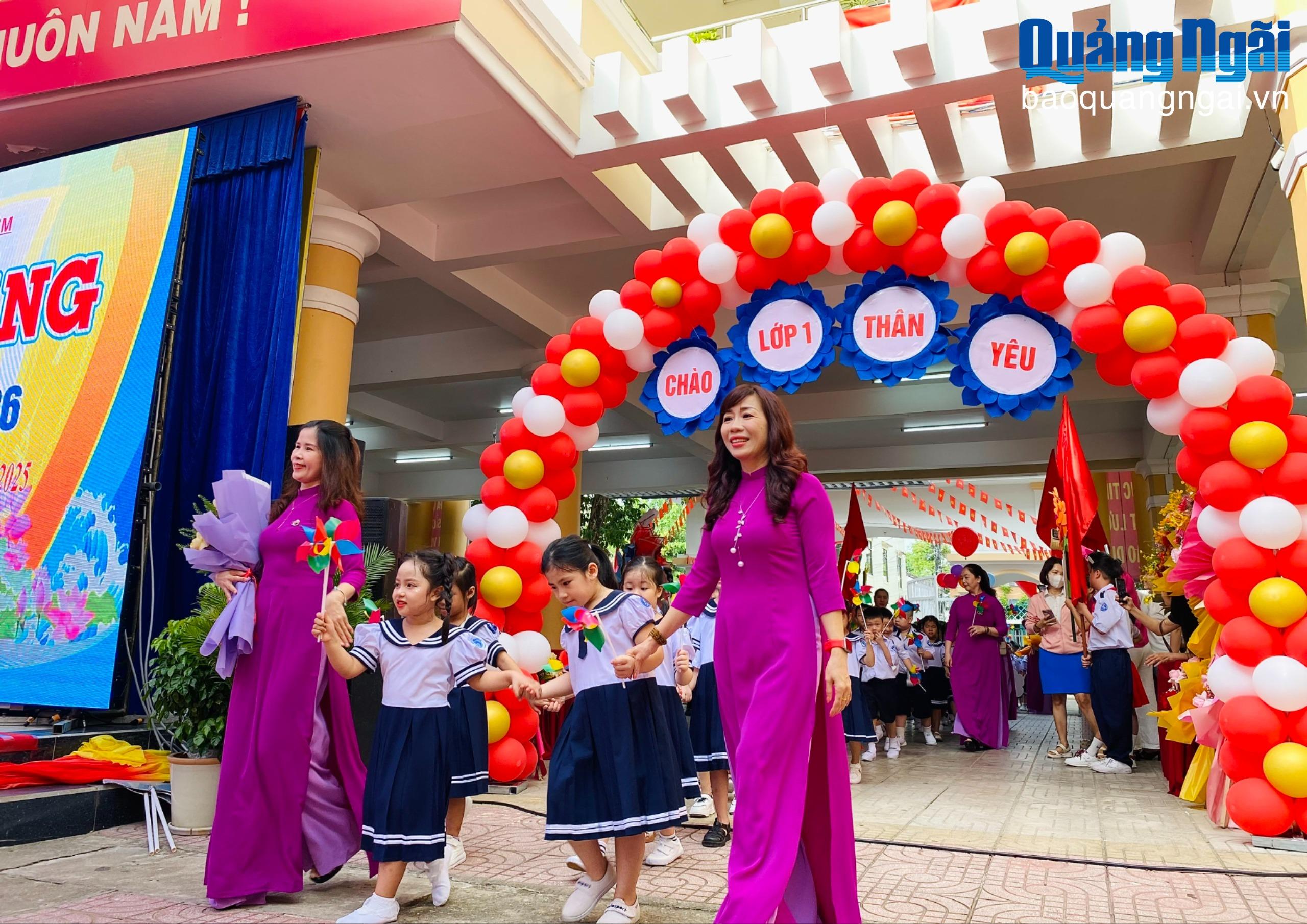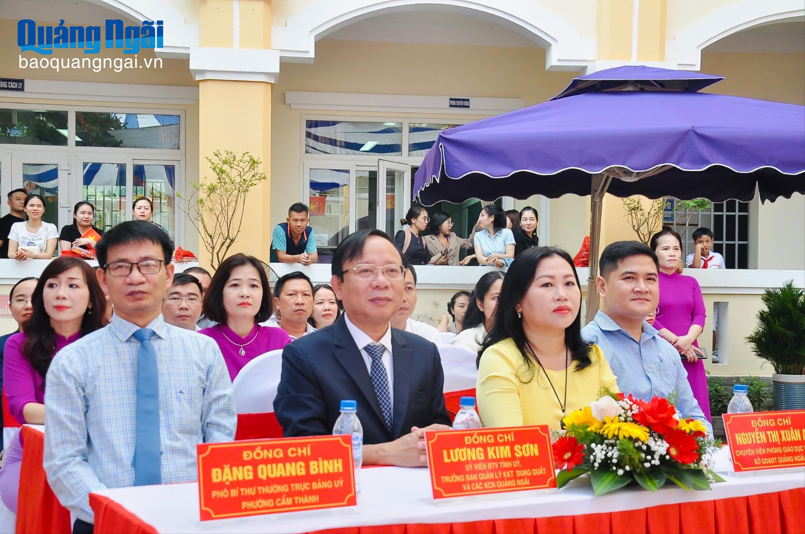 Trưởng ban Quản lý KKT Dung Quất và các KCN Quảng Ngãi Lương Kim Sơn và các đại biểu dự Lễ khai giảng tại Trường Tiểu học Nguyễn Nghiêm, phường Cẩm Thành.