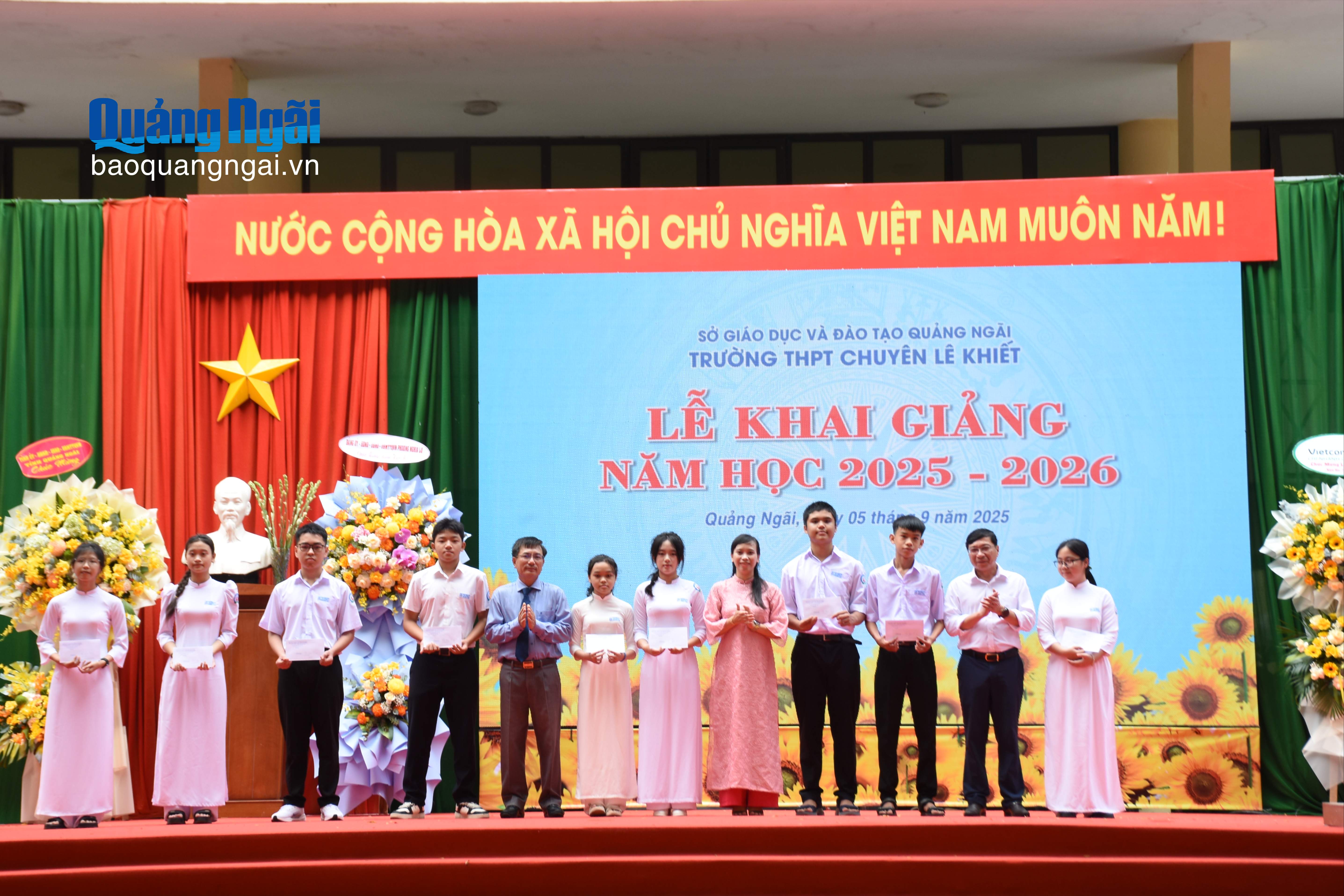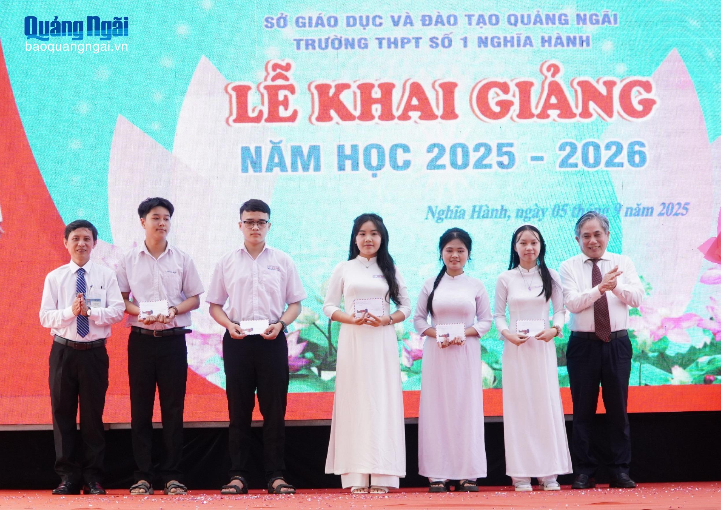 Trong khuôn khổ lễ khai giảng, Phó Chủ tịch Thường trực Hội Khuyến học tỉnh Trần Đức Minh đã trao bảng tượng trưng Chương trình học bổng SEEDS tài trợ năm học 2025 - 2026 với trị giá 221 triệu đồng cho nhà trường. Vietcombank Quảng Ngãi trao tặng 12 suất học bổng, với tổng trị giá 12 triệu đồng; các cựu học sinh Trường THPT Chuyên Lê Khiết trao 34 suất học bổng, với tổng trị giá 41 triệu đồng cho các học sinh có thành tích học tập tốt và học sinh có hoàn cảnh khó khăn.