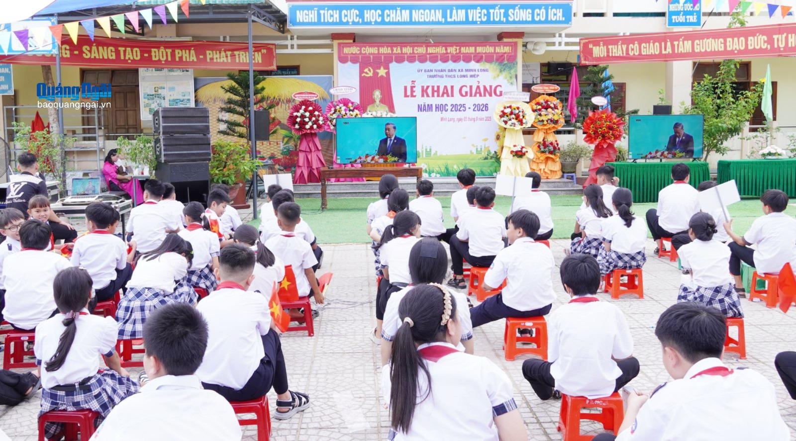 Tại lễ khai giảng, các đại biểu và toàn thể thầy cô giáo, học sinh nhà trường cùng theo dõi Lễ kỷ niệm 80 năm Truyền thống ngành Giáo dục và khai giảng năm học 2025 - 2026 được truyền hình trực tiếp từ điểm cầu chính Bộ GD&ĐT. Đây là lần đầu tiên, tất cả các cơ sở giáo dục trên toàn quốc chào cờ, hát Quốc ca cùng một thời điểm trong lễ khai giảng năm học mới.