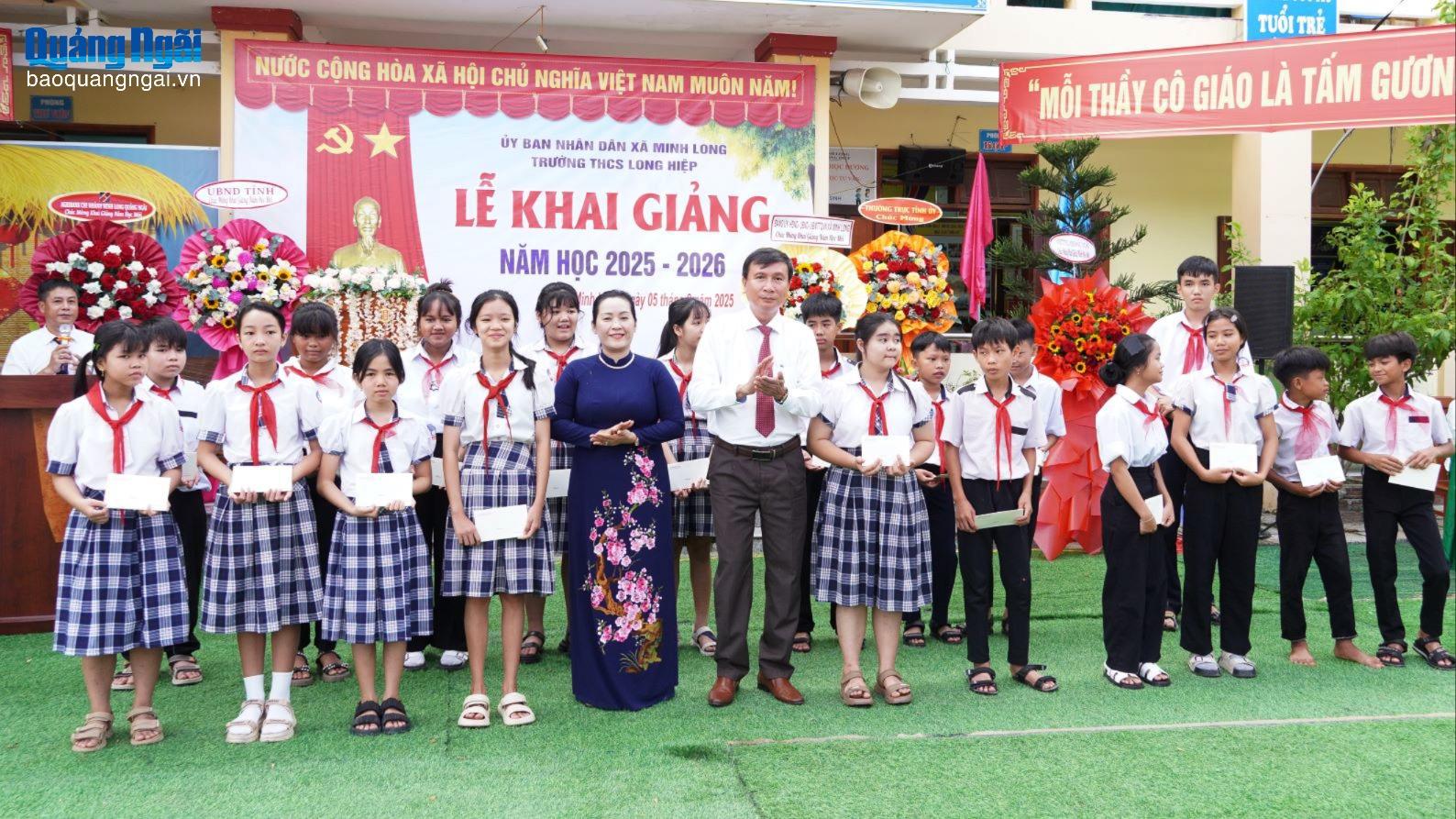 Tại buổi lễ, Phó Bí thư Tỉnh ủy Đinh Thị Hồng Minh, lãnh đạo các sở, ngành và địa phương đã trao 26 suất học bổng; tặng 2 xe đạp và 80 suất quà (gồm vở và sách giáo khoa) cho học sinh có hoàn cảnh khó khăn, học giỏi của Trường THCS Long Hiệp.