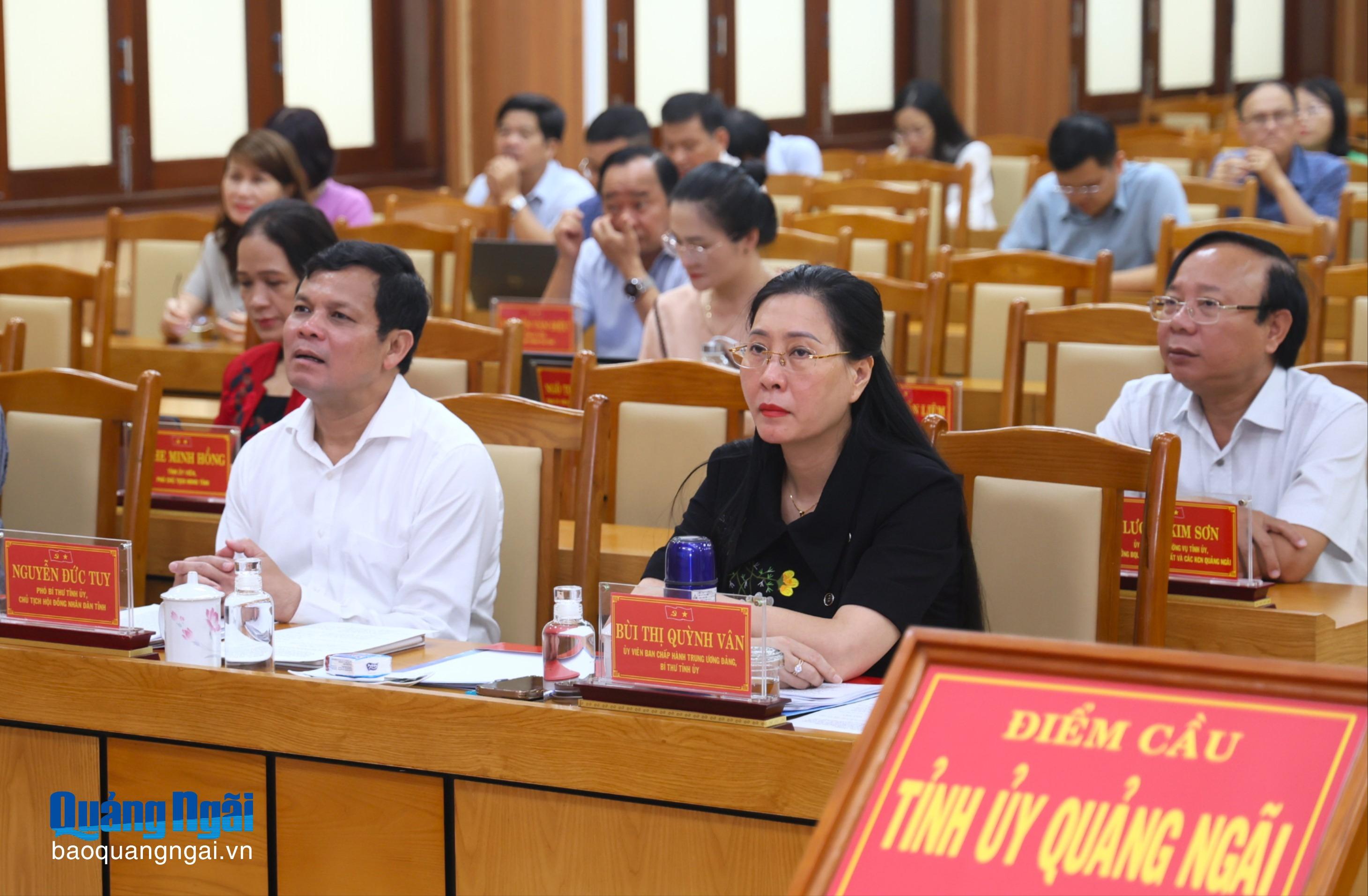 Ủy viên Trung ương Đảng, Bí thư Tỉnh ủy Bùi Thị Quỳnh Vân và các đại biểu dự hội nghị tại điểm cầu Tỉnh ủy Quảng Ngãi.