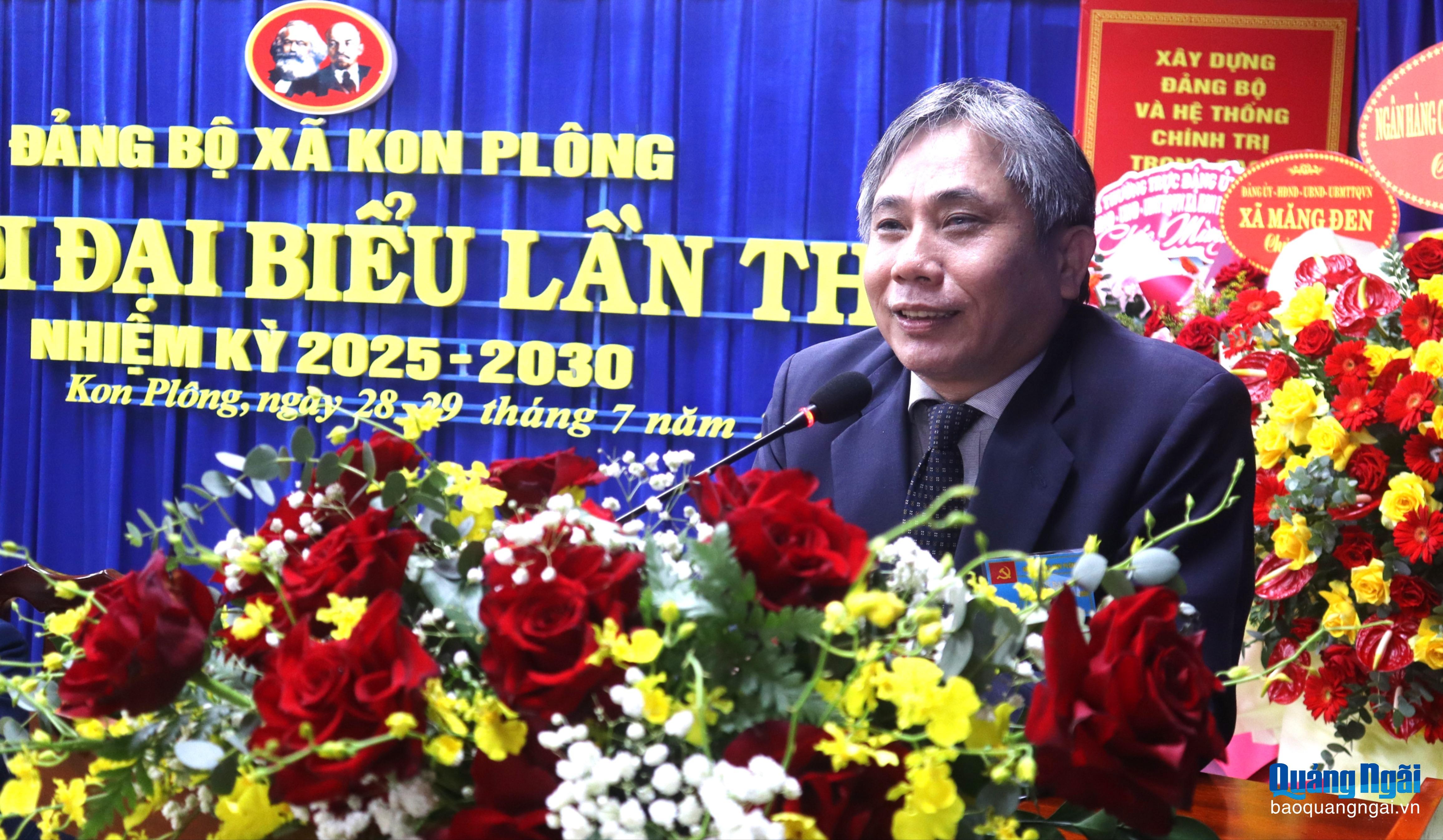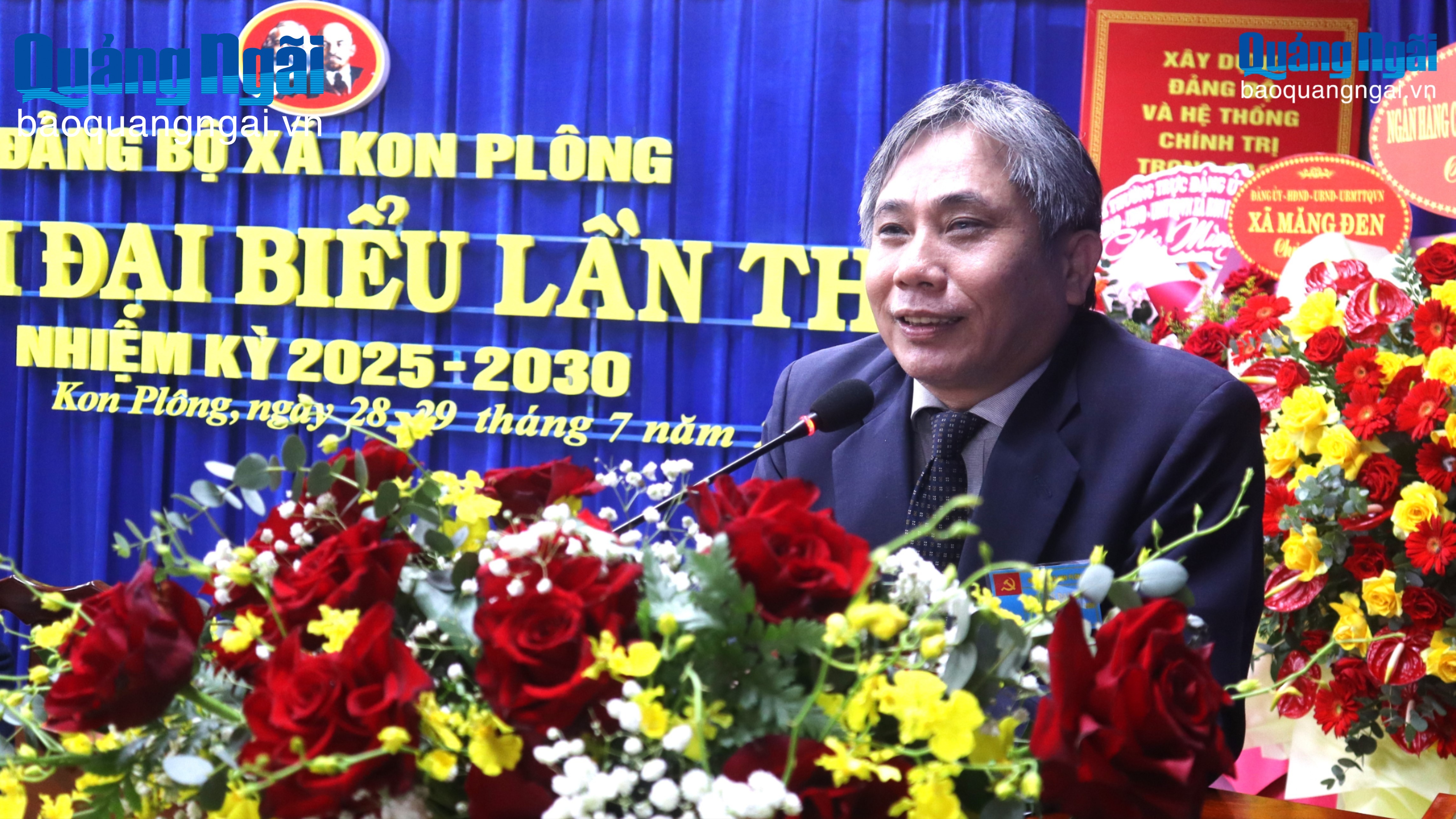 Phát biểu chỉ đạo đại hội, Ủy viên Ban Thường vụ Tỉnh ủy, Trưởng ban Tổ chức Tỉnh ủy Lữ Ngọc Bình ghi nhận, biểu dương những kết quả mà xã đạt được trong nhiệm kỳ qua cũng như công tác chuẩn bị nội dung văn kiện và công tác tổ chức đại hội trong bối cảnh xã còn gặp nhiều khó khăn. Trong nhiệm kỳ 2025 - 2030, Đảng bộ xã Kon Plông cần phát huy tiềm năng, lợi thế về khí hậu, đất đai để phát triển kinh tế vì phần lớn diện tích xã nằm trong vùng quy hoạch phát triển Khu du lịch Măng Đen đã được Thủ tướng Chính phủ phê duyệt.