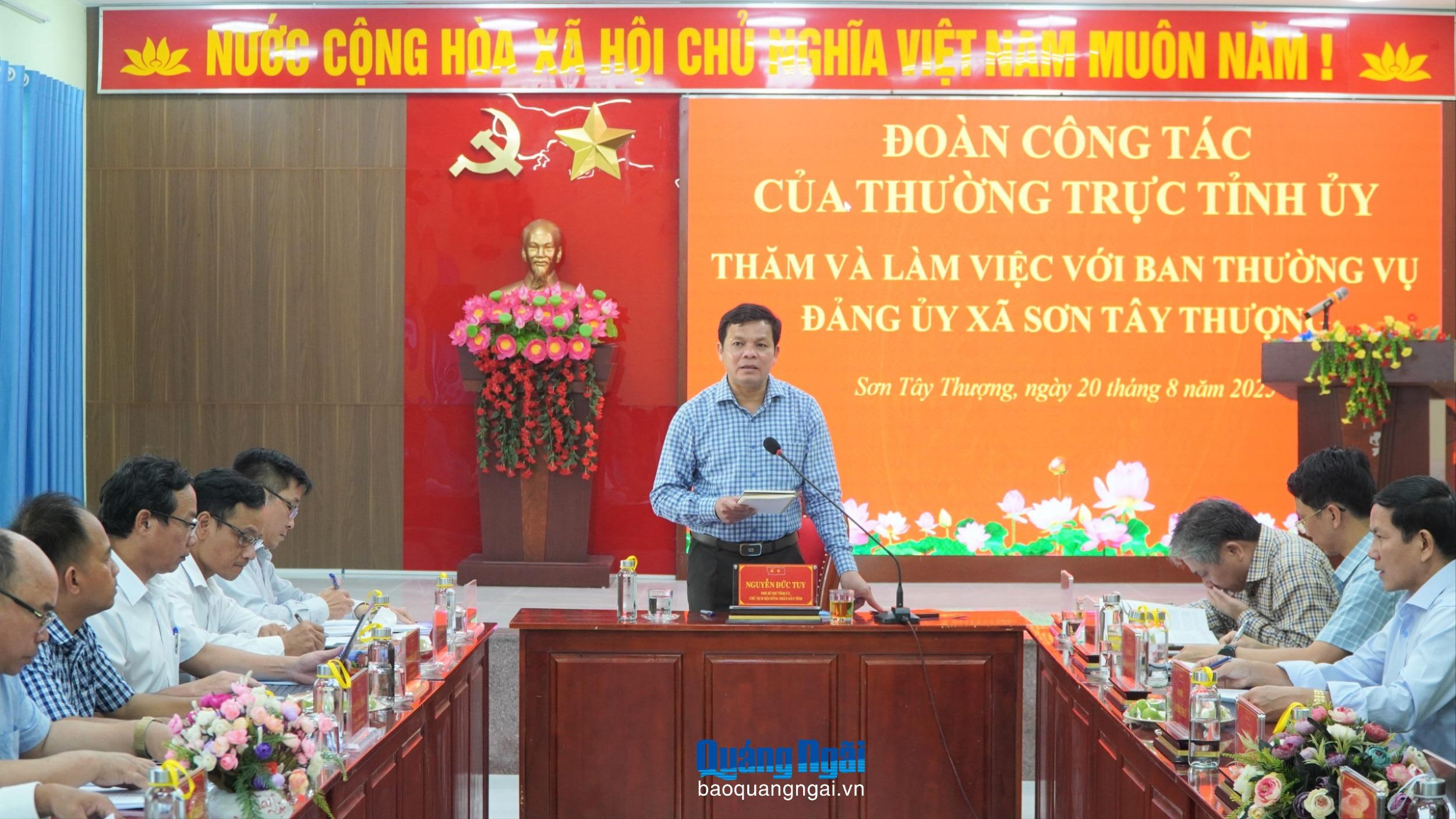 Sáng 20/8, Phó Bí thư Tỉnh ủy, Chủ tịch HĐND tỉnh Nguyễn Đức Tuy có buổi làm việc với Ban Thường vụ Đảng ủy xã Sơn Tây Thượng về tình hình phát triển kinh tế, xã hội; kết quả thực hiện nhiệm vụ từ khi thành lập xã đến nay, phương hướng từ nay đến cuối năm 2025 và công tác triển khai Nghị quyết Đại hội Đảng bộ xã nhiệm kỳ 2025 - 2030.