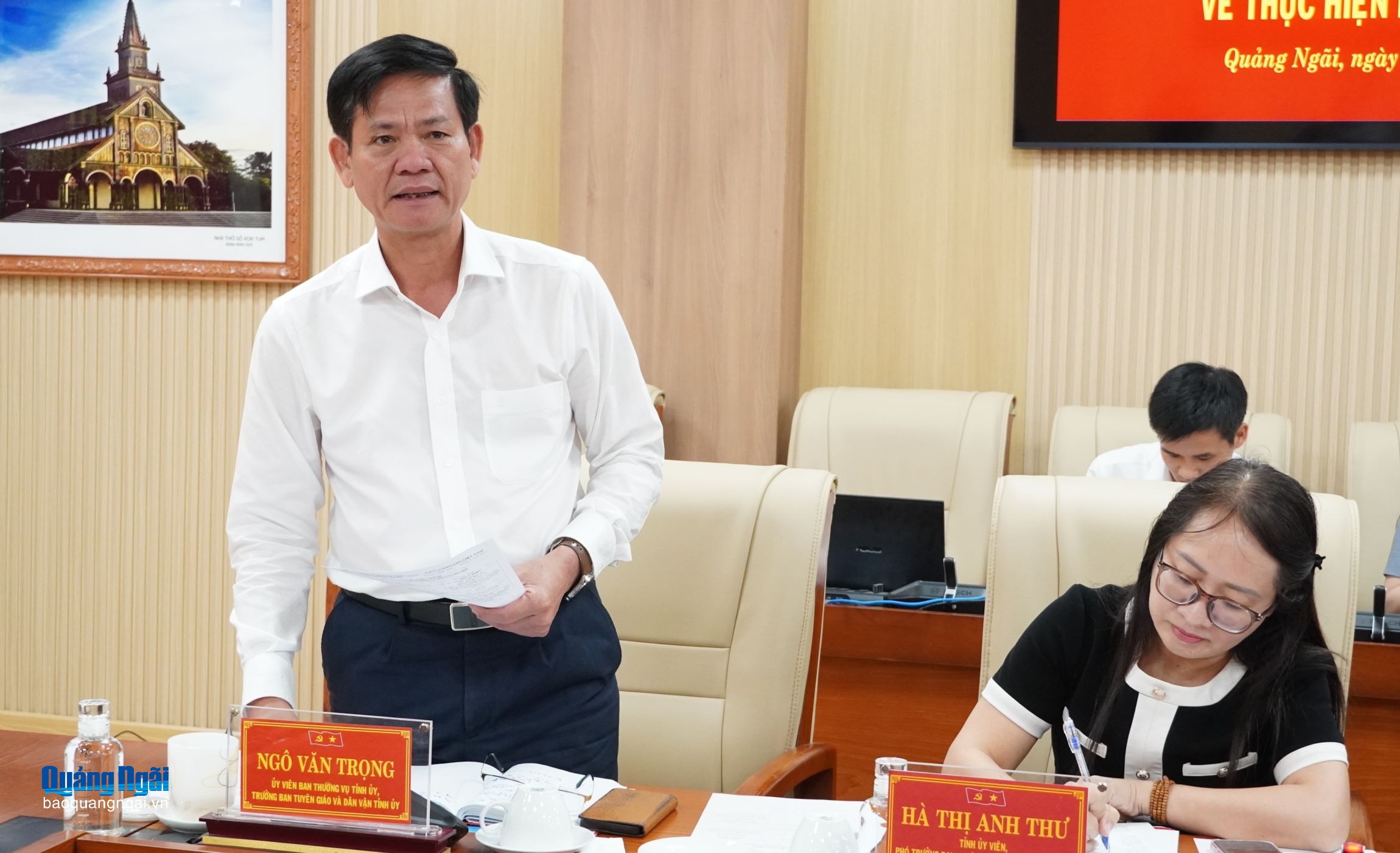 Ủy viên Ban Thường vụ Tỉnh ủy, Trưởng ban Tuyên giáo và Dân vận Tỉnh ủy Ngô Văn Trọng trao đổi tại hội nghị.