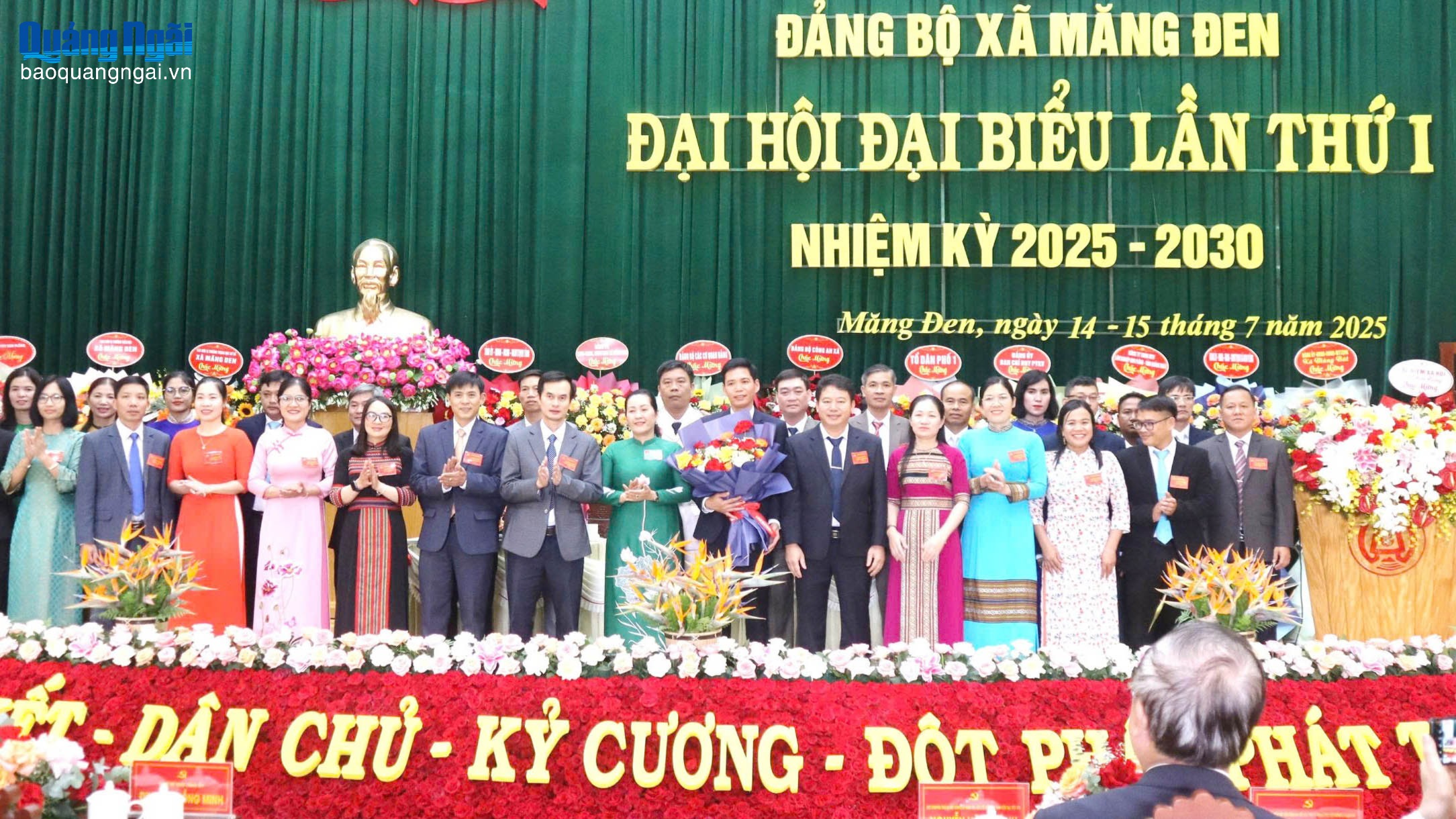Phó Bí thư Tỉnh ủy Đinh Thị Hồng Minh và lãnh đạo tỉnh tặng hoa chúc mừng Ban Chấp hành Đảng bộ xã Măng Đen, nhiệm kỳ 2025 - 2030.