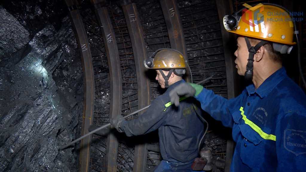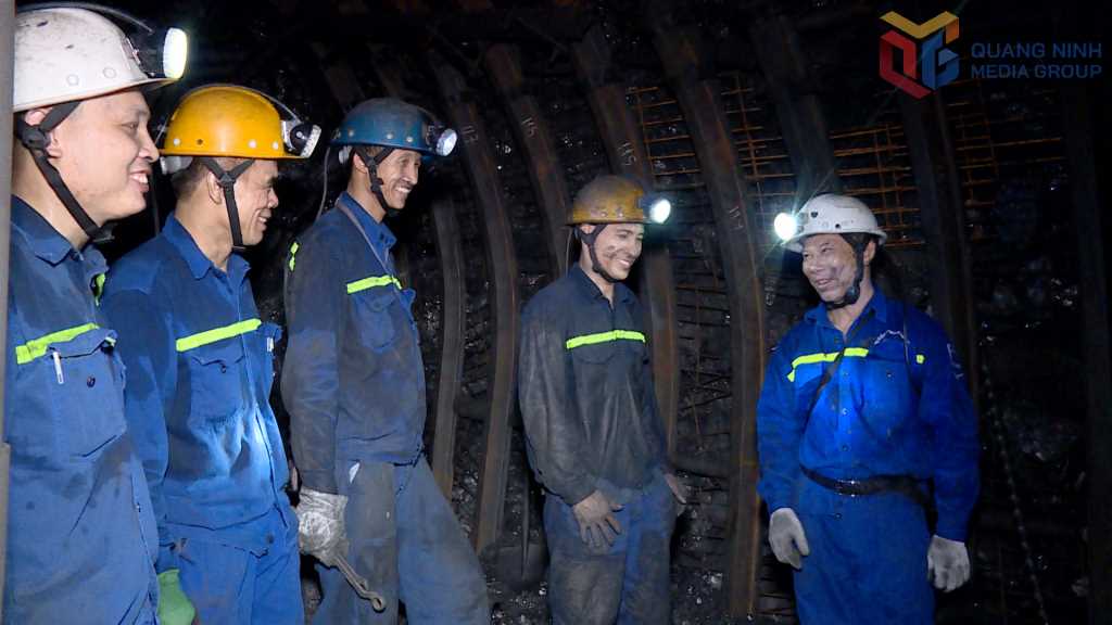 Lãnh đạo Đảng ủy Công ty CP Than Vàng Danh động viên thợ lò Phân xưởng K1 tại vị trí sản xuất.