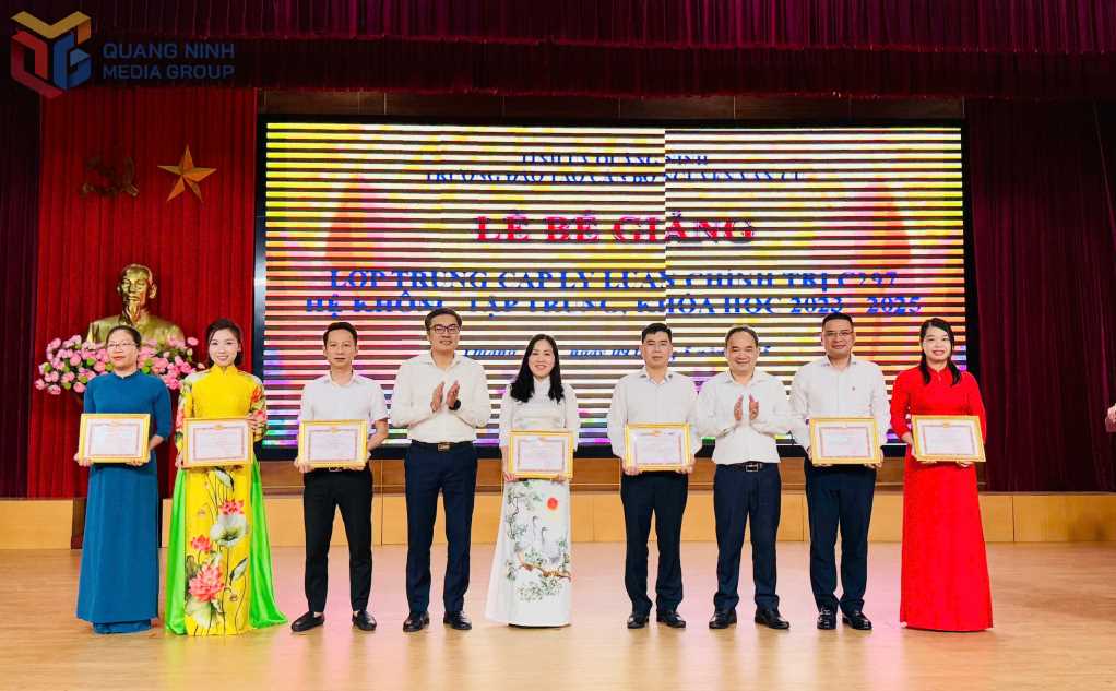 Lãnh đạo Ban Tổ chức Tỉnh ủy trao giấy khen cho các học viên lớp trung cấp lý luận chính trị đạt thành tích cao trong học tập, rèn luyện. Ảnh: Mạnh Trường