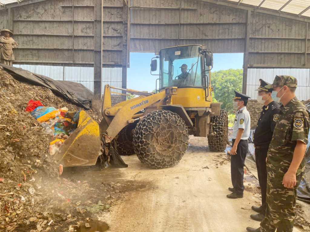 Lực lượng chức năng tiến hành tiêu hủy 300kg chân lợn đông lạnh không rõ nguồn gốc bị bắt giữ ngày 17/10/2025 tại phường Móng Cái 1. (Ảnh: Chi cục QLTT tỉnh)